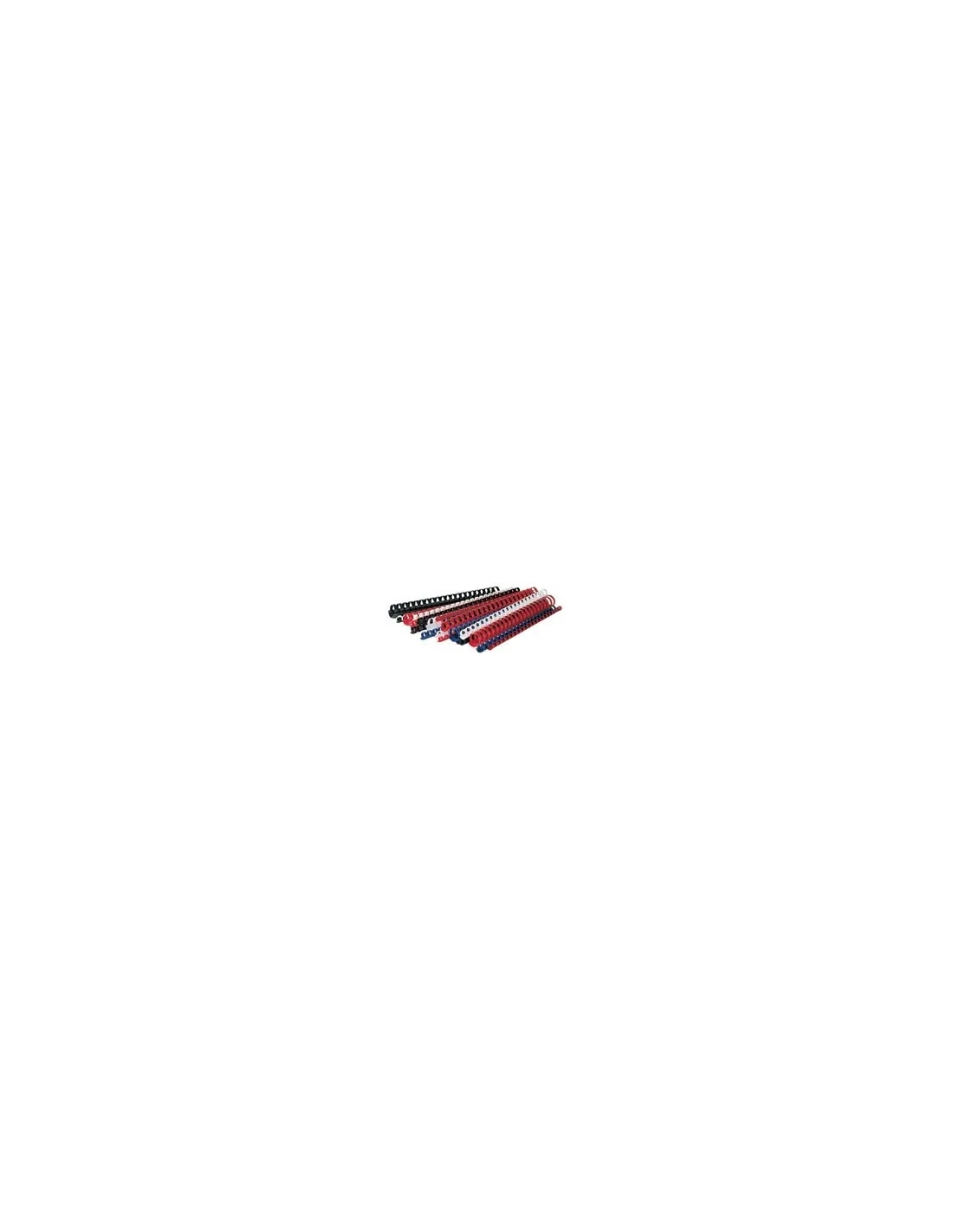 Universales para todas las máquinas . 30 cm de largo (21 anillas). Permiten un corte fácil con tijeras. 4 colores: negro, blanco, rojo, azul. Caja de 100 unidades.