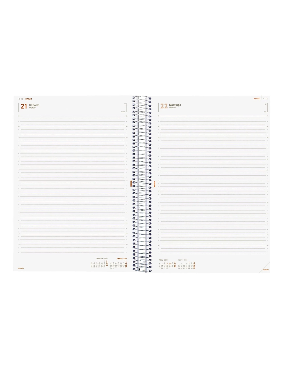 Agenda día por página Finocam Year encuadernada con espiral de estilo moderno tapas ligeras de polipropileno y cierre con goma elástica. Ideal para uso personal y/o profesional. Esquinas microperforadas para localizar rápidamente el día/semana en curso. Agenda con información de interés en la anualidad y otros contenidos extra.