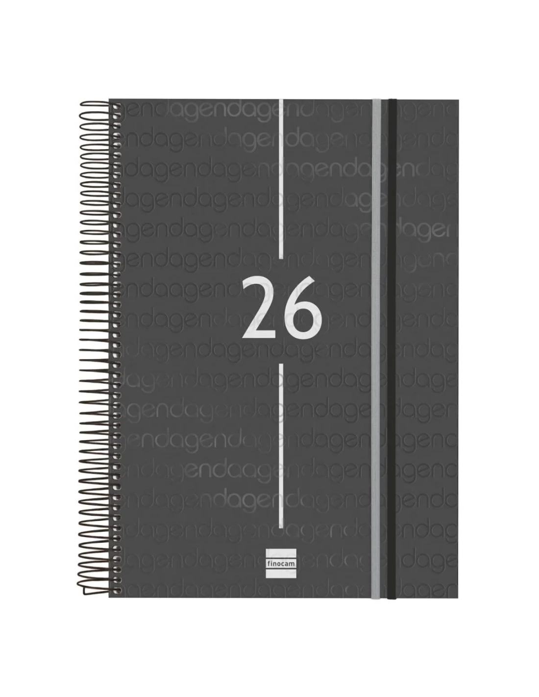 FINOCAMAgenda Year día página. Tapas de polipropileno gris. Encuadernada en espiral. Cierre con goma elástica. Contiene: anualidad 1 día página, calendario, plan anual y hojas para notas, teléfonos y direcciones.