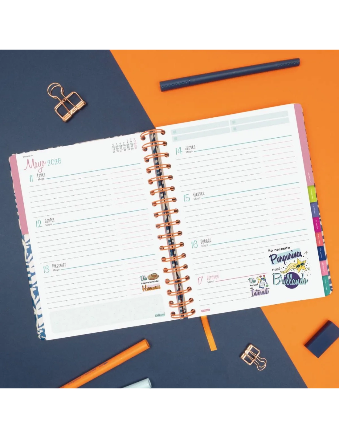 La anualidad de la agenda contiene: festivos, cambios de estación, días especiales y una frase TALKUAL para cada semana. Con planificación mensual cuadriculada y contenido temático intercalados en la anualidad.