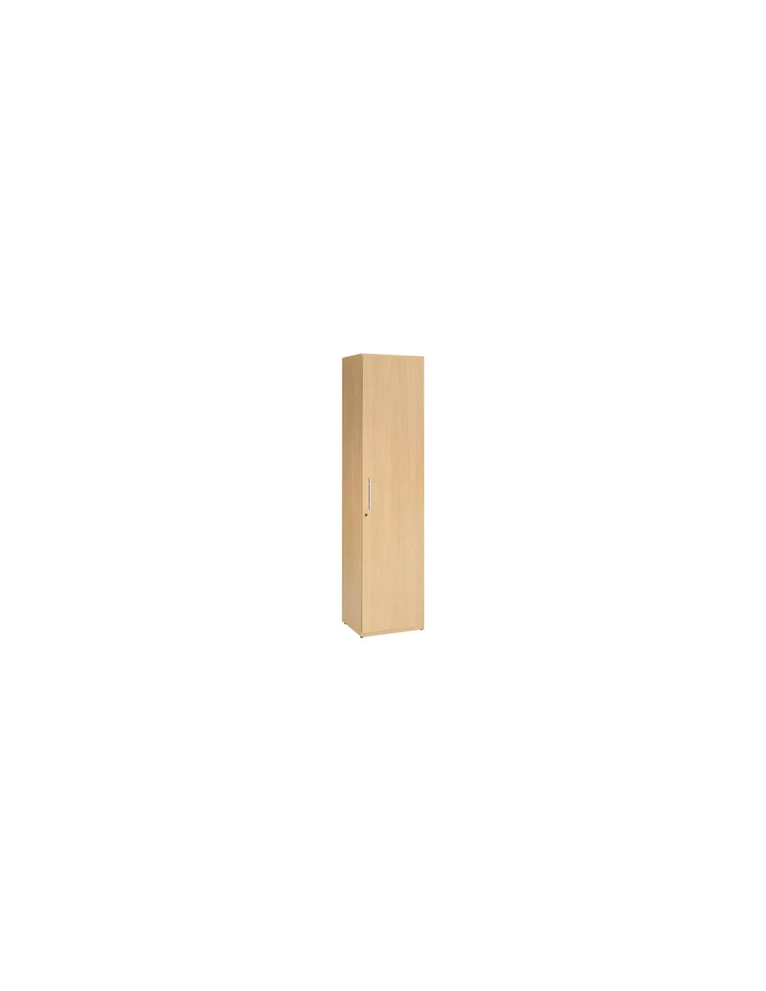 Armario alto estrecho para oficina con revestimiento melaminado haya. 4 baldas: 1 fija y 3 regulables en altura. Puerta batiente con cerradura. Dimensiones : Alt 181 x An 45 (utiles 40.5 cm) x fon 40 cm (utiles 37 cm).