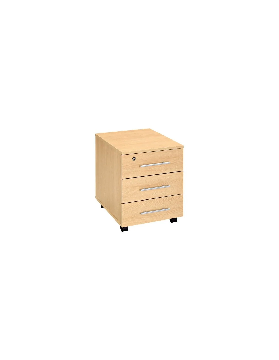 Cajonera de paneles de partículas melaminadas grosor 22 mm. Tiradores de plástico color aluminio y cerradura solo para el cajón superior. 3 cajones de clasificación en plano. 4 ruedas.