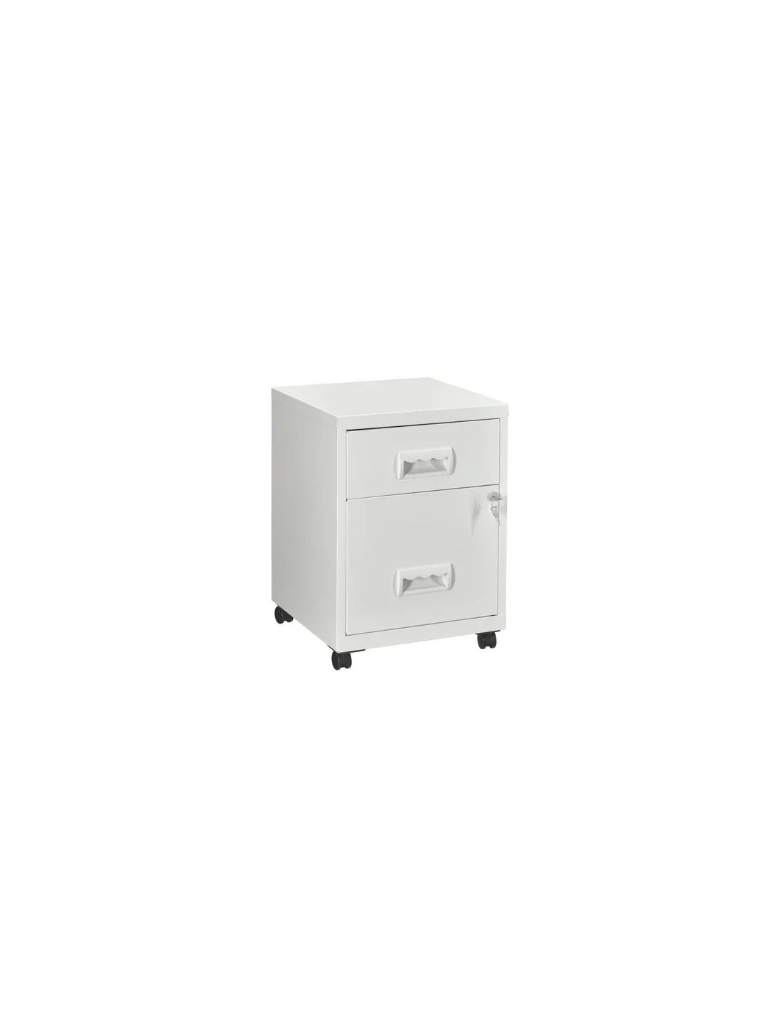 Cajonera metalica con ruedas budget 2 cajones, Estructura : Monobloc chapa de acero, acabado epoxi granulado antirayaduras. Deslizamiento cajones dezlisantes sobre guías de bolas. Cerradura ( 2 llaves incluidas). 4 ruedas multidireccionales.