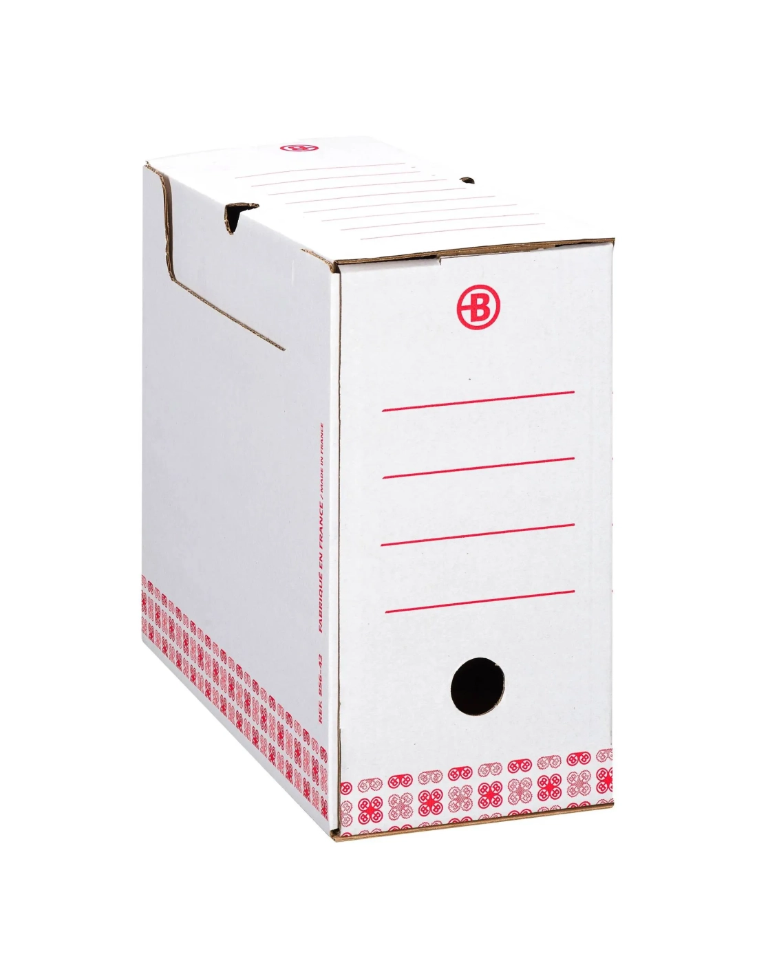 Caja de archivo definitivo Fabricadas en cartón 100% reciclado, impresión en rojo.