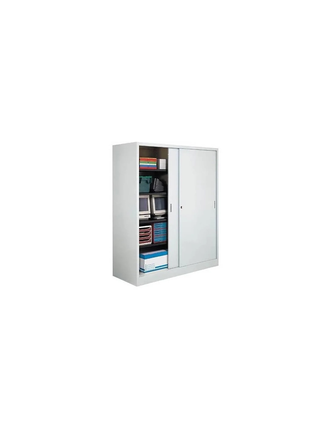 Armario metalico con cierre con puertas correderas con apertura suave y silenciosa gracias a los amortiguadores. Cerradura con 2 llaves incluidas.