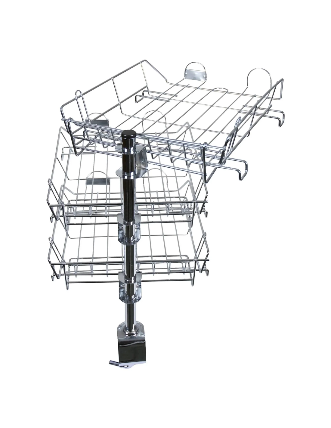 Conjunto de 3 bandejas metálicas con soporte giratorio cromado, giro de 360 grados. Las bandejas por separado son apilables. Para formatos DIN A4. Con portatarjetas de identificación. Dimensiones: Fon. 370 x An. 275 x Alt. 90 mm.