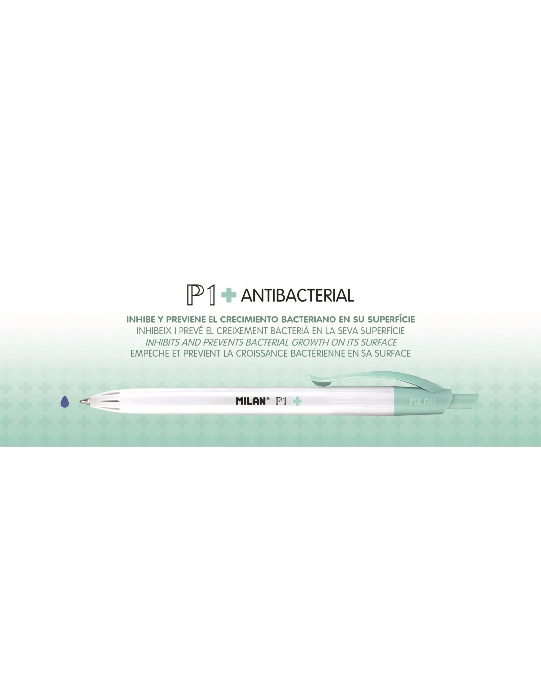 Boligrafo Milan P1 antibacteriano tinta clásica base aceite de color azul.escritura 1 mm , El cuerpo del bolígrafo contiene un tratamiento que inhibe y previene el crecimiento bacteriano, gracias a los iones de plata. Ideal para mejorar la higiene en la escuela, oficina, ambientes en contacto con alimentos y entornos sanitarios.
