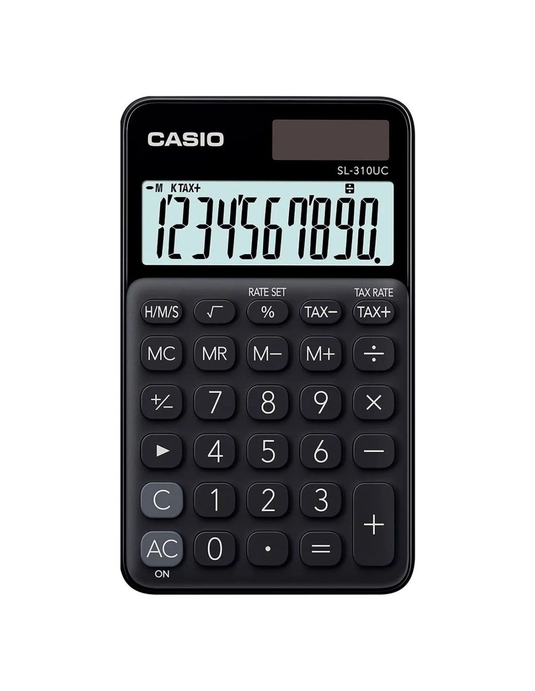 Calculadora de sobremesa casio. Pantalla LCD extragrande de 10 dígitos. Alimentación combinada solar/bateria. Cálculo de impuestos y porcentaje. 4 teclas de memoria. Tecla de símbolo +/-. Raíz cuadrada Dim: 80 x 70 x 118 mm