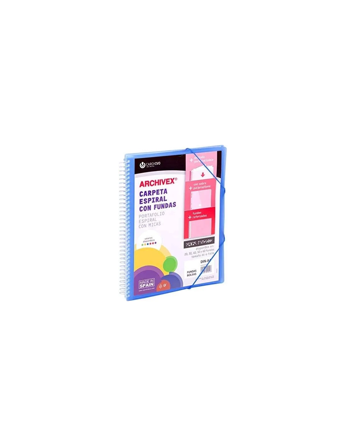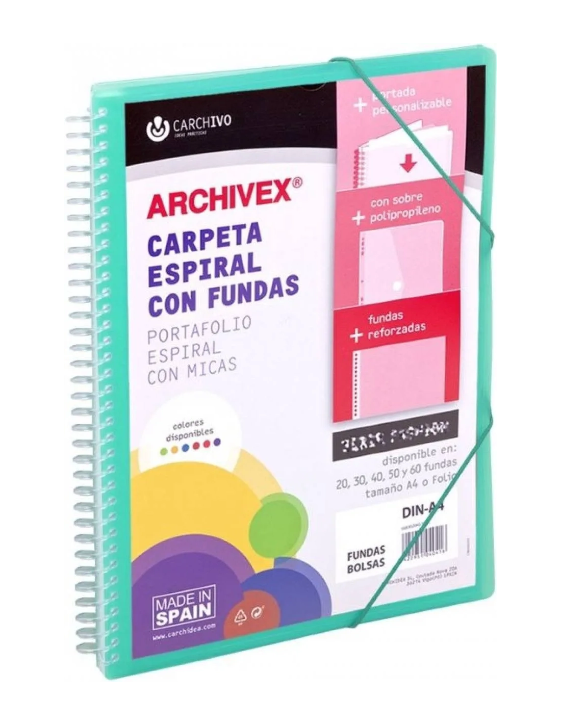Carpeta de fundas Archivex encuadernada en espiral de plástico indeformable y cierre de goma redonda con portada canguro personalizable, fundas reforzadas incluye sobre polipropileno en la contraportada con cierre de velcro, ideal para guardar bolígrafos , tarjetas monedas etc.