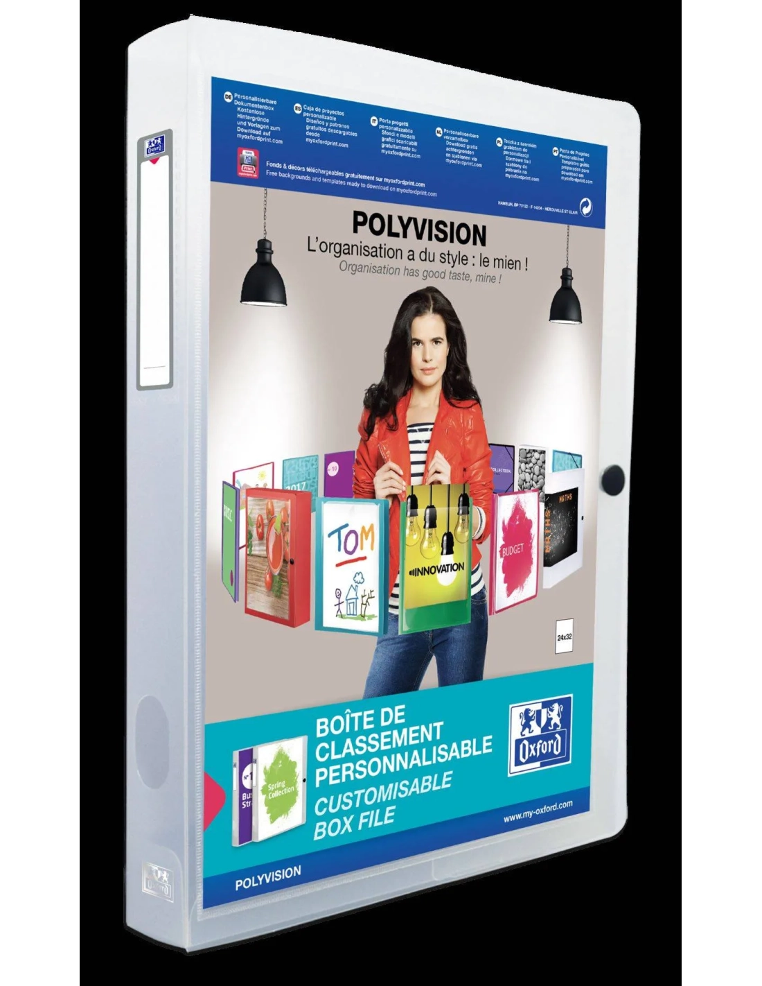 Carpeta proyectos Oxford Polyvision lomo de 40mm 3 solapas fijas con portada personalizable fabricada en polipropileno translucido, cierre con broche, etiqueta adhesiva identificadora, ollao en el lomo, capacidad para 400 hojas.