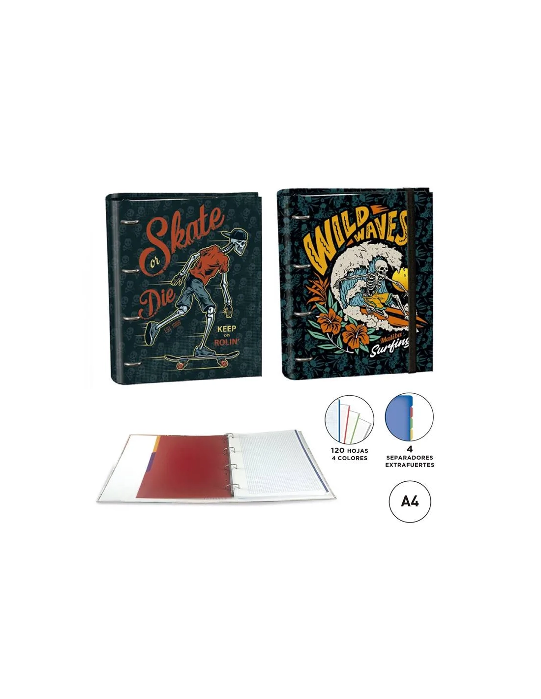 Carpeta con 4 anillas de 35mm y recambio de 120 hojas de colores con cuadricula de 5 mm con 4 separadores extrafuertes para una mejor separación de las asignaturas.
