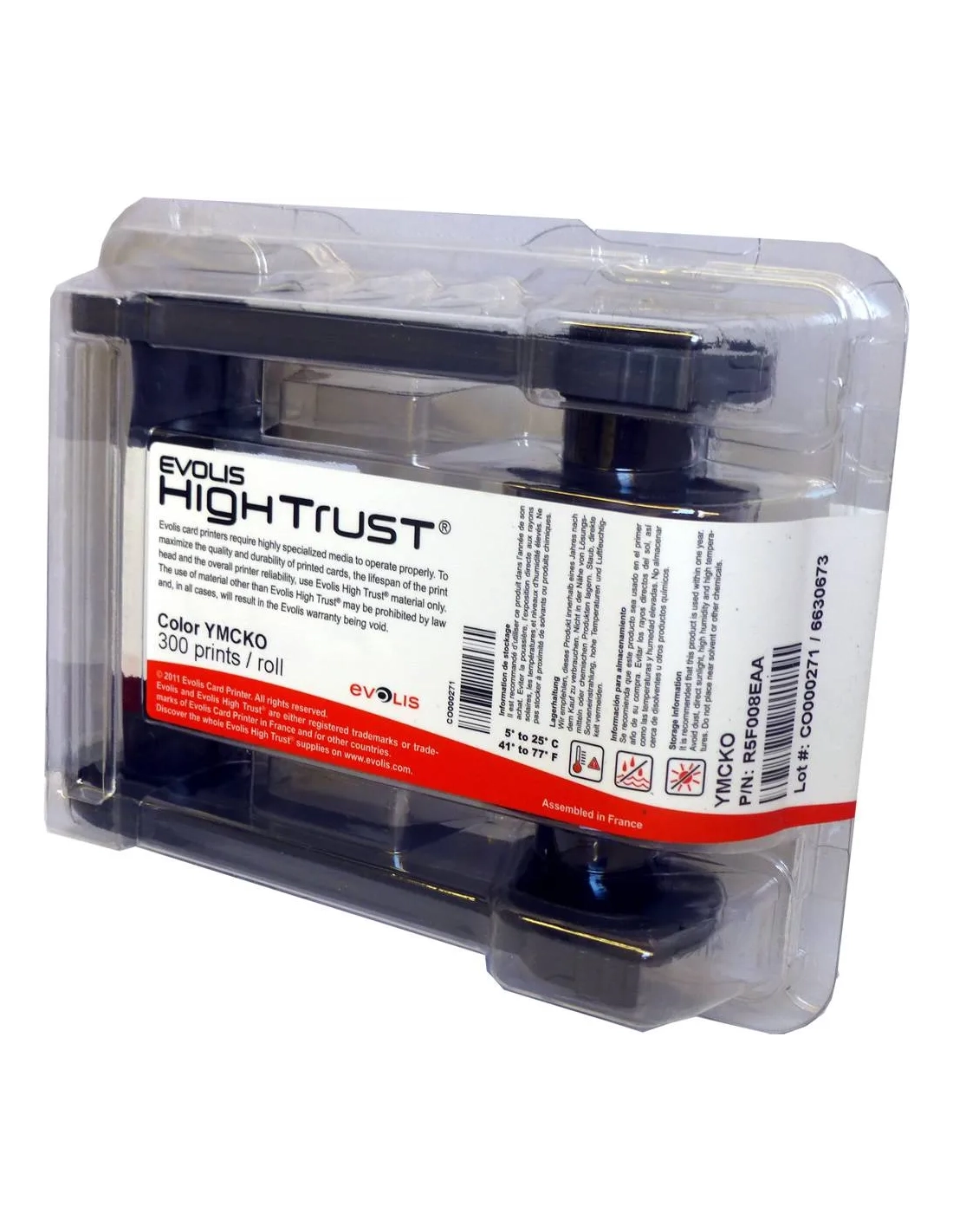 Cartucho evolis de cinta de color de cinco paneles YMCKO realizada en PET, con tecnología de impresión de transferencia térmica