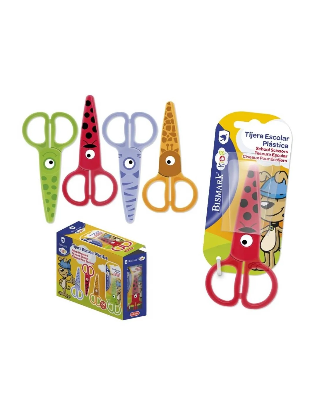 Tijera infantil 12,5 cm plástica de dibujos con punta redonda solo corta papel, colores surtidos.