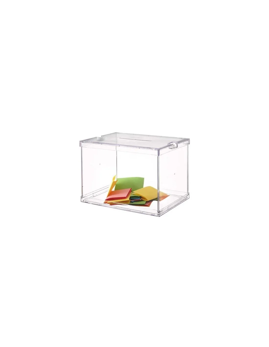 Urna electoral plegable modelo oficial. Fabricada en poliestireno en color cristal transparente, con base de color blanco. Medidas ranura: 180x8. Incluye 2 precintos de seguridad.Medidas: Alt.31.5 x An.44 x Fon.31 cm.Urna electoral plegable modelo oficial. Fabricada en poliestireno en color cristal transparente, con base de color blanco. Medidas ranura: 180x8.