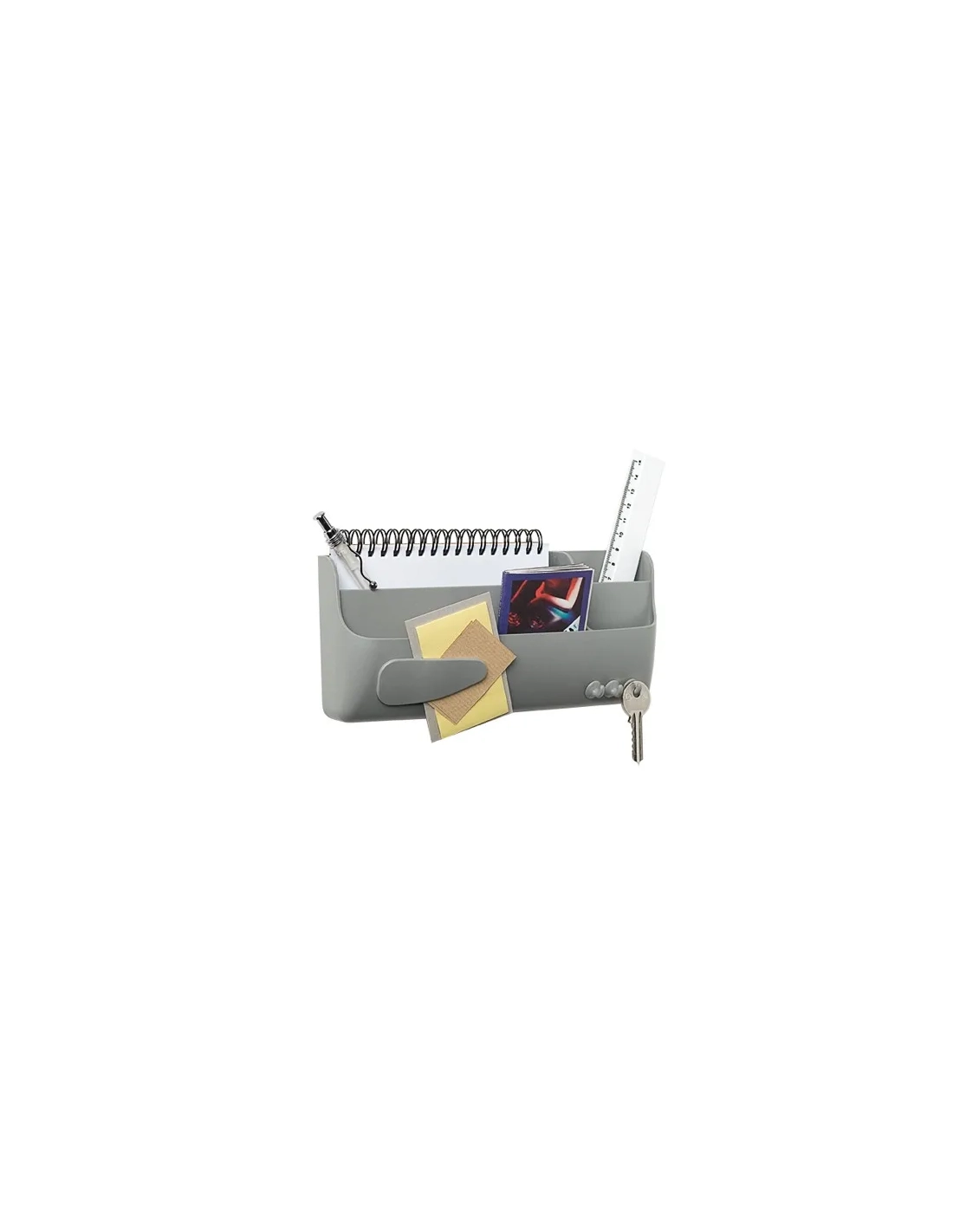 Cajetín magnetico multiuso de plástico rígido gris compuesto de 4 compartimentos para accesorios, 1 pinza, y 3 ganchos.