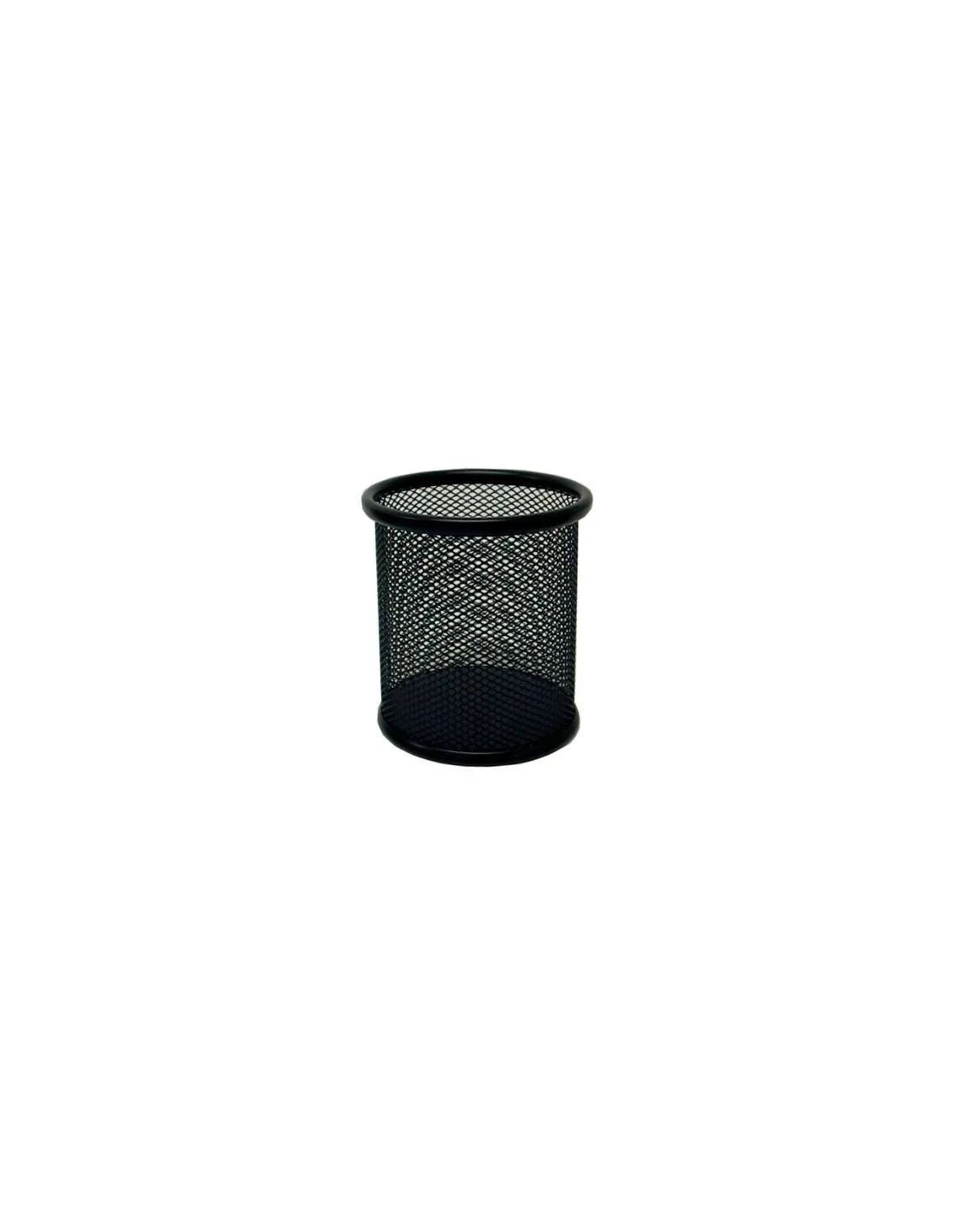 Portalapices de sobremesa con forma cilíndrica de rejilla metálica, dimensiones del cubilete: base de 8 cm de diámetro y 10 cm de altura.