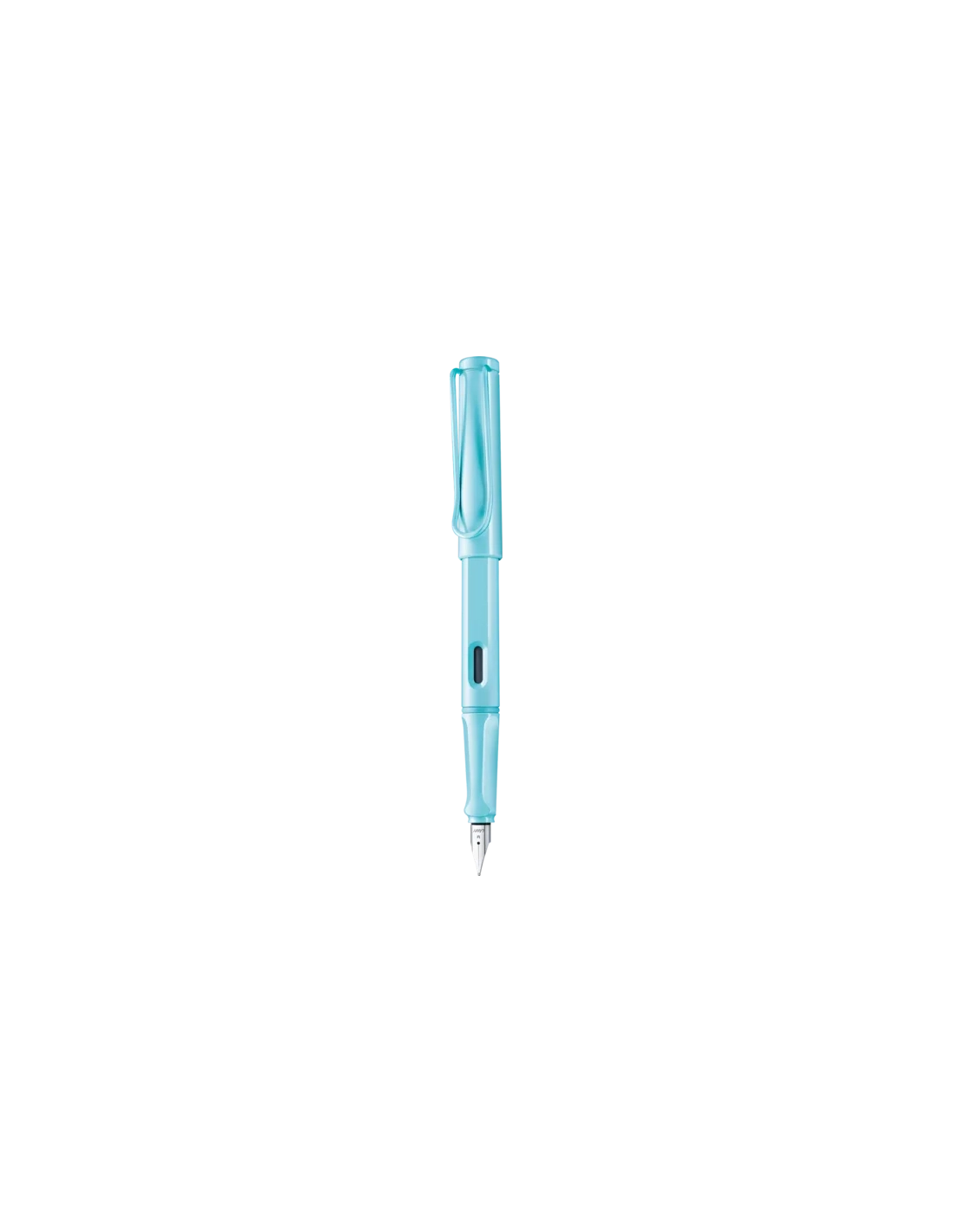 Pluma Lamy realizada en plástico ABS de color azul brillante pastel, de diseño atemporal, perfectamente ergonómico, con clip metálico elástico lacado a juego. Plumín en acero cromado disponible en trazo M. Sistema de carga por cartucho. Posibilidad de adaptar convertidor Z24 para cargar directamente de tintero.