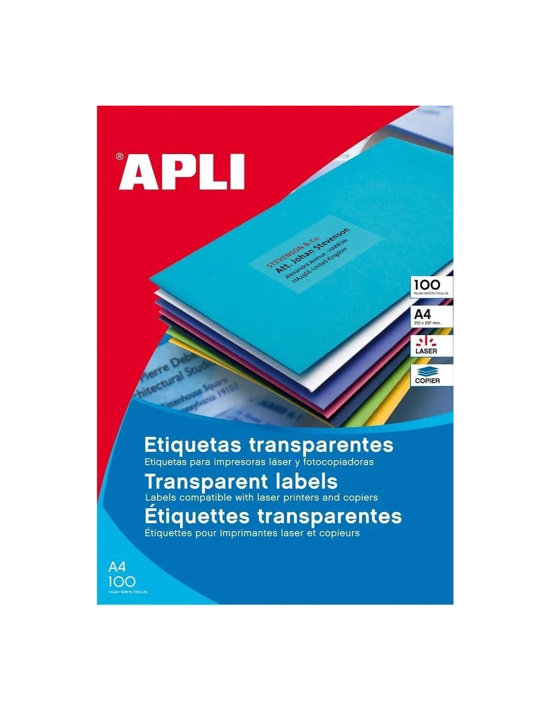 APLIEtiquetas de poliester transparentes en formato A4 que son adecuadas para impresoras láser y fotocopiadora El tipo del adhesivo es permanente Las dimensiones son 210 x 297 mm La caja viene con 100 hojas. resistentes a la intemperie de poliester de máxima duración con adhesivo permanente en formato A4, aptas para impresoras laser y fotocopiadoras