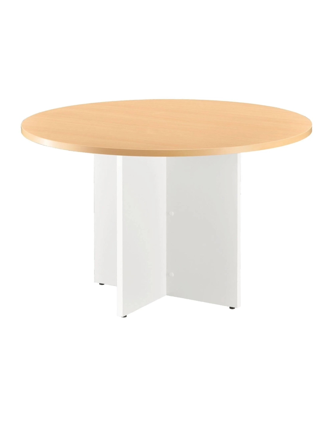 Mesa de oficina redonda fabricada de tablero de paneles de partículas de melamina de alta densidad, 25 mm de grosor, cantos de PVC antichoque de 3 mm. Patas en cruz de paneles de partículas melaminadas.