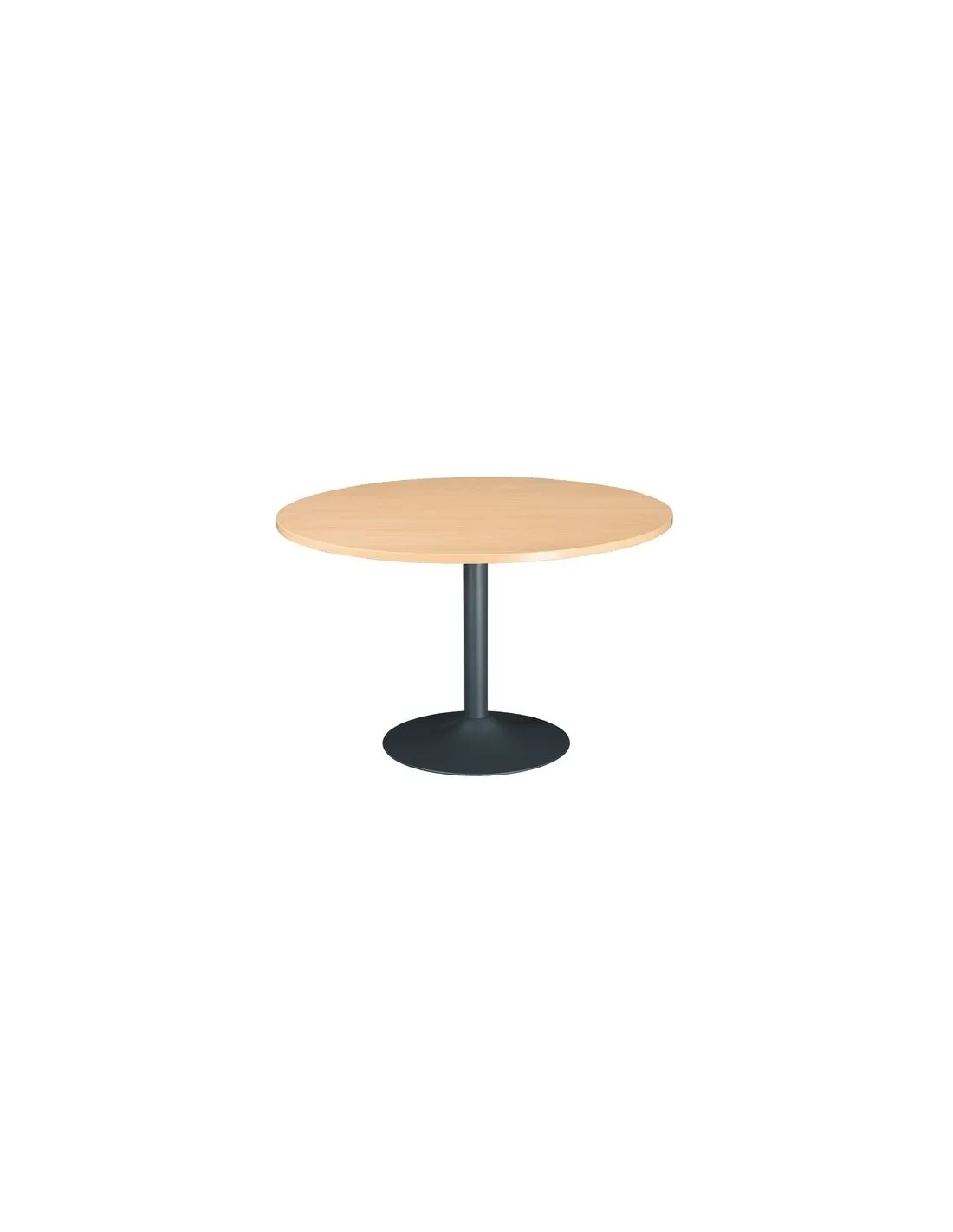 Mesa de oficina redonda fabricada de tablero de paneles de partículas de melamina de alta densidad, 25 mm de grosor, cantos de PVC antichoque de 3 mm pata metálica en columna lacada epoxi con base circular de 60 cm