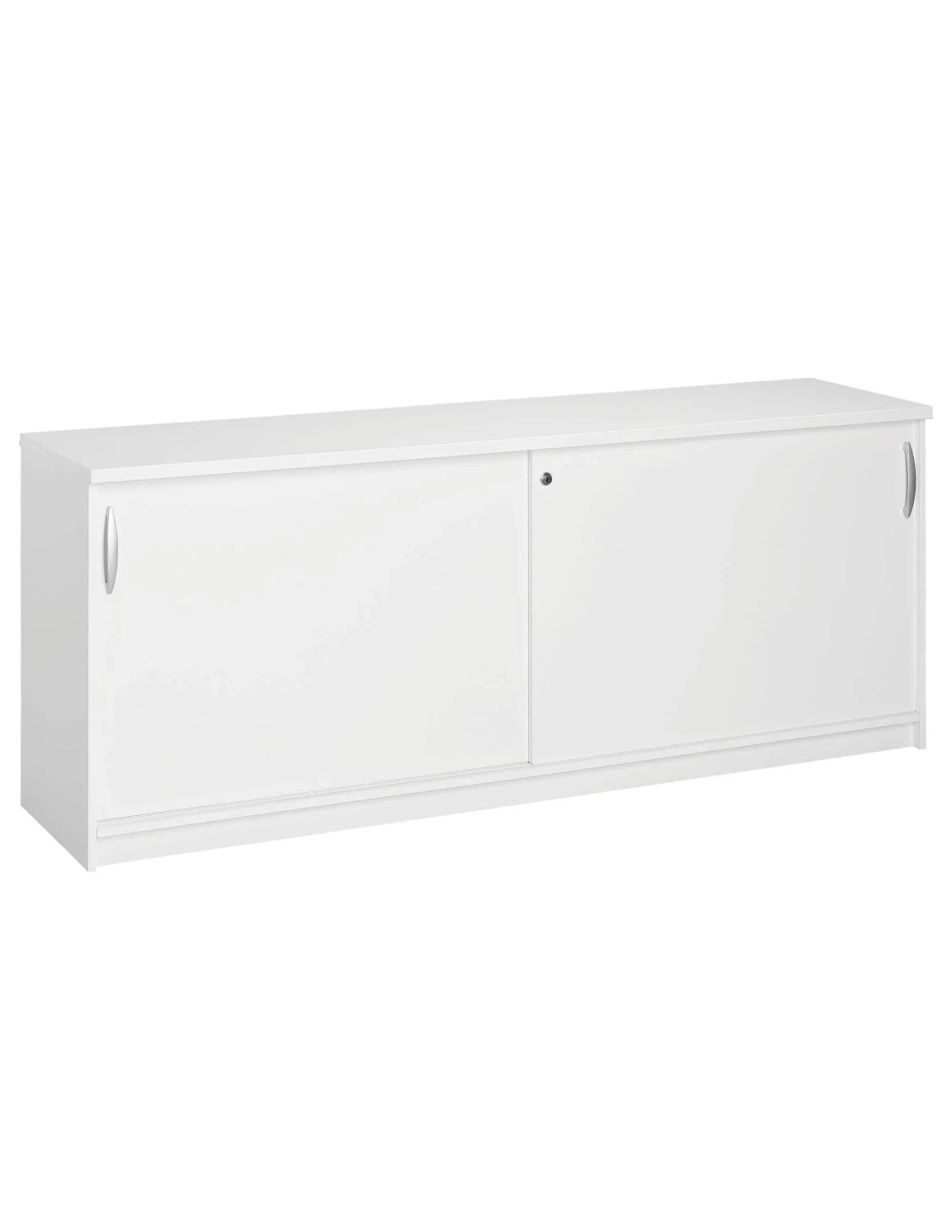 Armario aparador con tiradores de metal acabado aluminio, puertas correderas con cerradura (2 llaves incluidas) con dos compartimentos interiores independientes con 1 balda a cada lado regulable en altura.