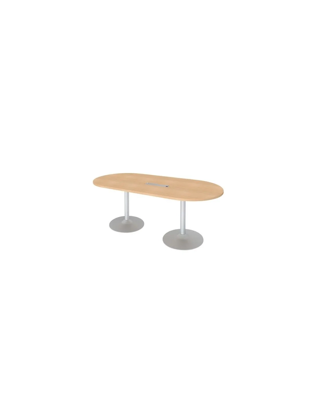 Mesa de reunión ovalada tablero único de madera Excellens , tablero de partículas de melanina de alta densidad con un grosor de 25mm, pasacables plástico rectangular color aluminio integrado en el tablero