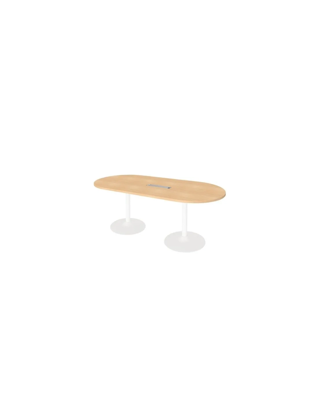 Mesa de reunión ovalada tablero único de madera Excellens , tablero de partículas de melanina de alta densidad con un grosor de 25mm, pasacables plástico rectangular color aluminio integrado en el tablero
