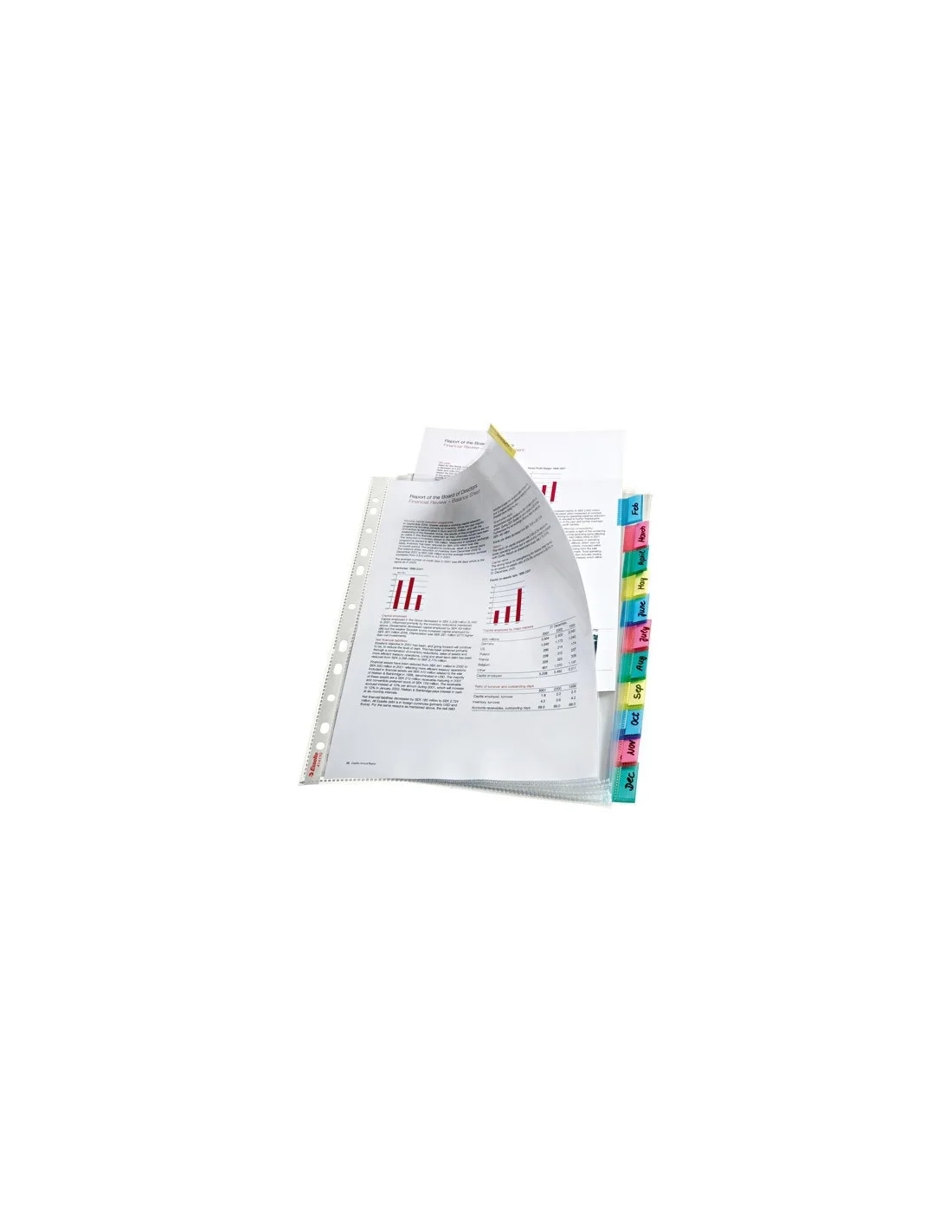 Fabricadas en polipropileno de 85 micras. Incorporan pestañas de colores y etiquetas para identificarlas. Permiten clasificar documentos sin necesidad de utilizar separadores. Tamaño A4. Formato: 12 pestañas. UMV: 12 fundas.Fundas con pestaña Esselte A4 12 pestañas