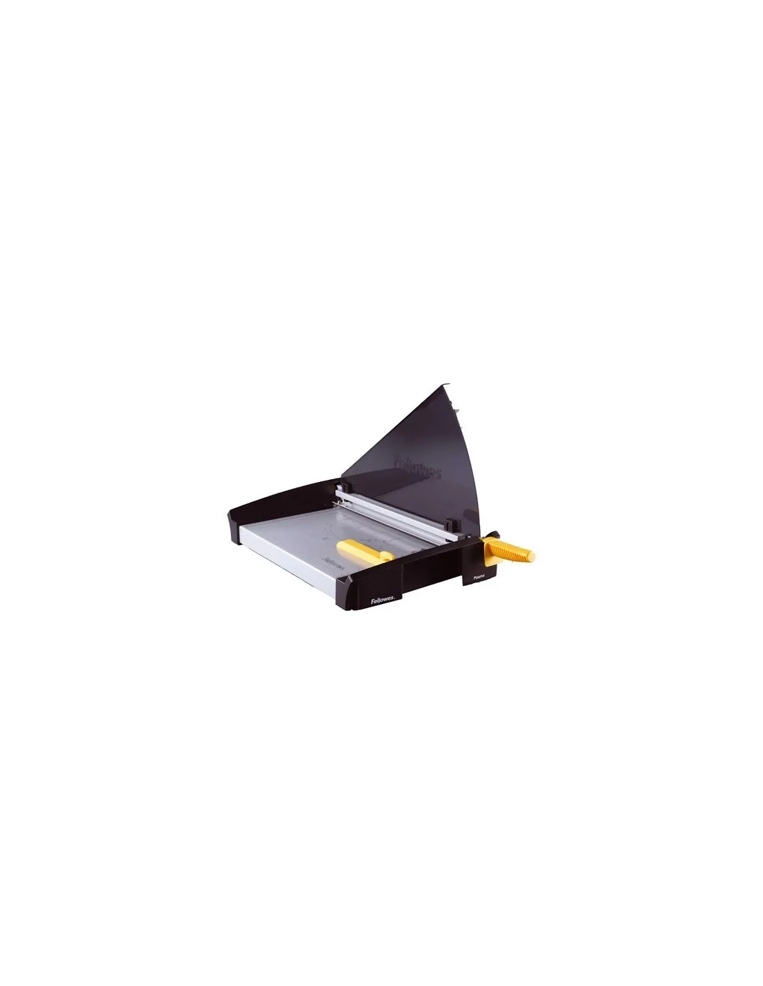Guillotina Fellowes Plasma A3. Guillotina de palanca de gran capacidad. Corte hasta 40 hojas. Cuchilla de corte de acero inoxidable y contracuchilla. Protector de seguridad de cuchilla pre-ensamblado y plegable, para poder almacenar la guillotina con facilidad sin tener que quitar el protector. Base metálica con guías grabadas de formatos de papel, fotos y radios para el corte en ángulo.