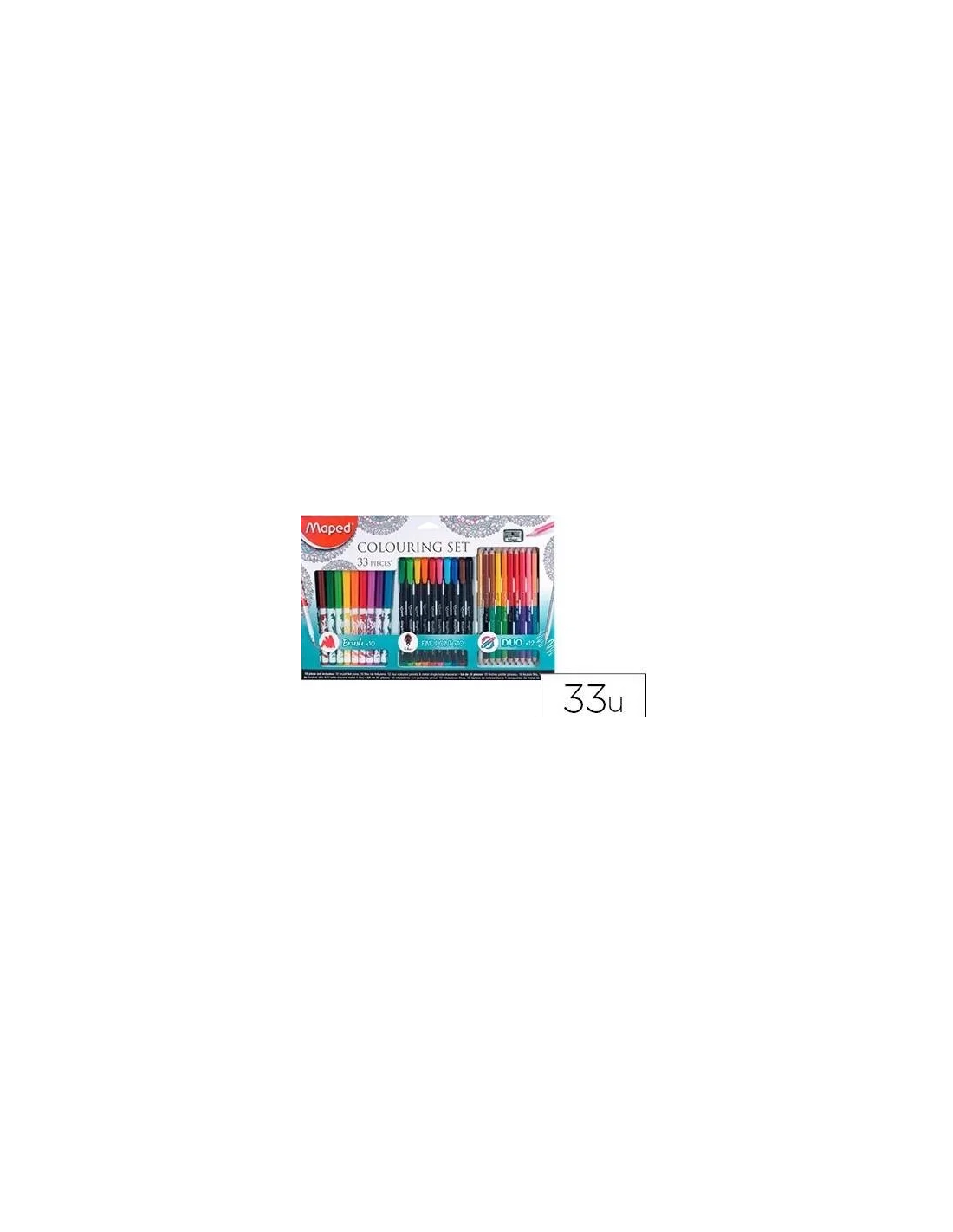 Set de dibujo de 33 piezas. Ideal para colorear mandalas. Contiene: - 10rotuladores Graph´Peps extra fine 0,4 mm, - 10 rotuladores Color´Peps,- 12 lápices de colorear Duo y un sacapuntas de metal.