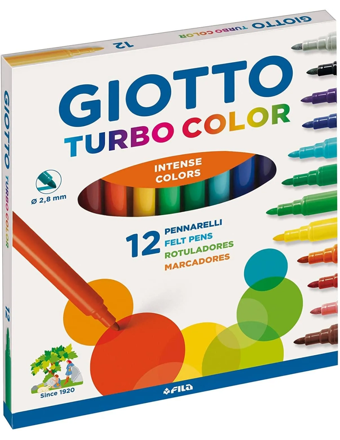 Rotuladores escolares Giotto turbo con tinta segura para niños a base de agua fácilmente lavables de la piel con agua y jabón , los rotuladores Giotto Turbo Color siempre están preparados y de muy larga duración.