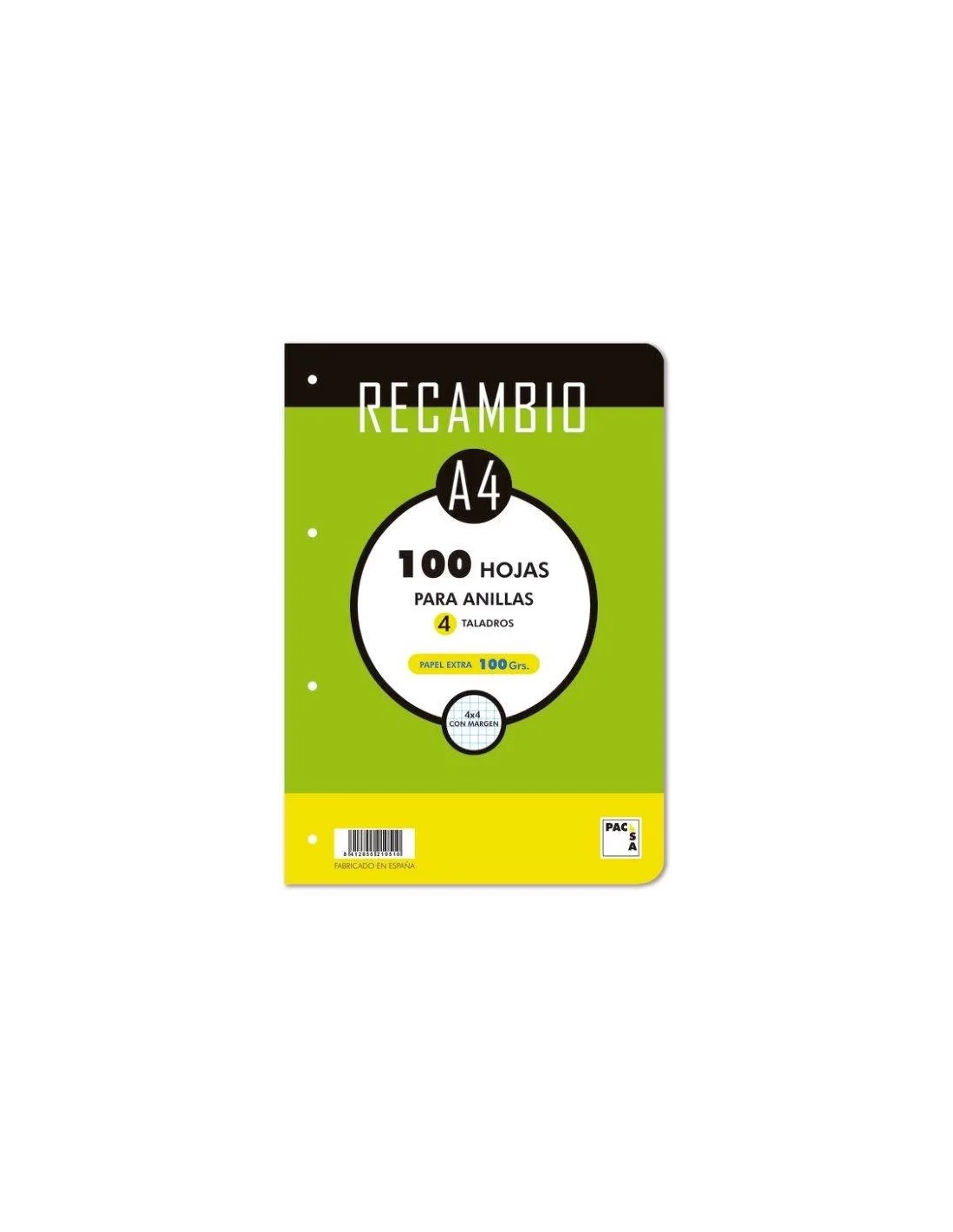 Recambio A4 Pacsa 100 hojas cuadriculado con cuadro de 4x4mm grosor de 100 gramos para que no traspase la tinta  4 agujeros con esquinas redondas.
