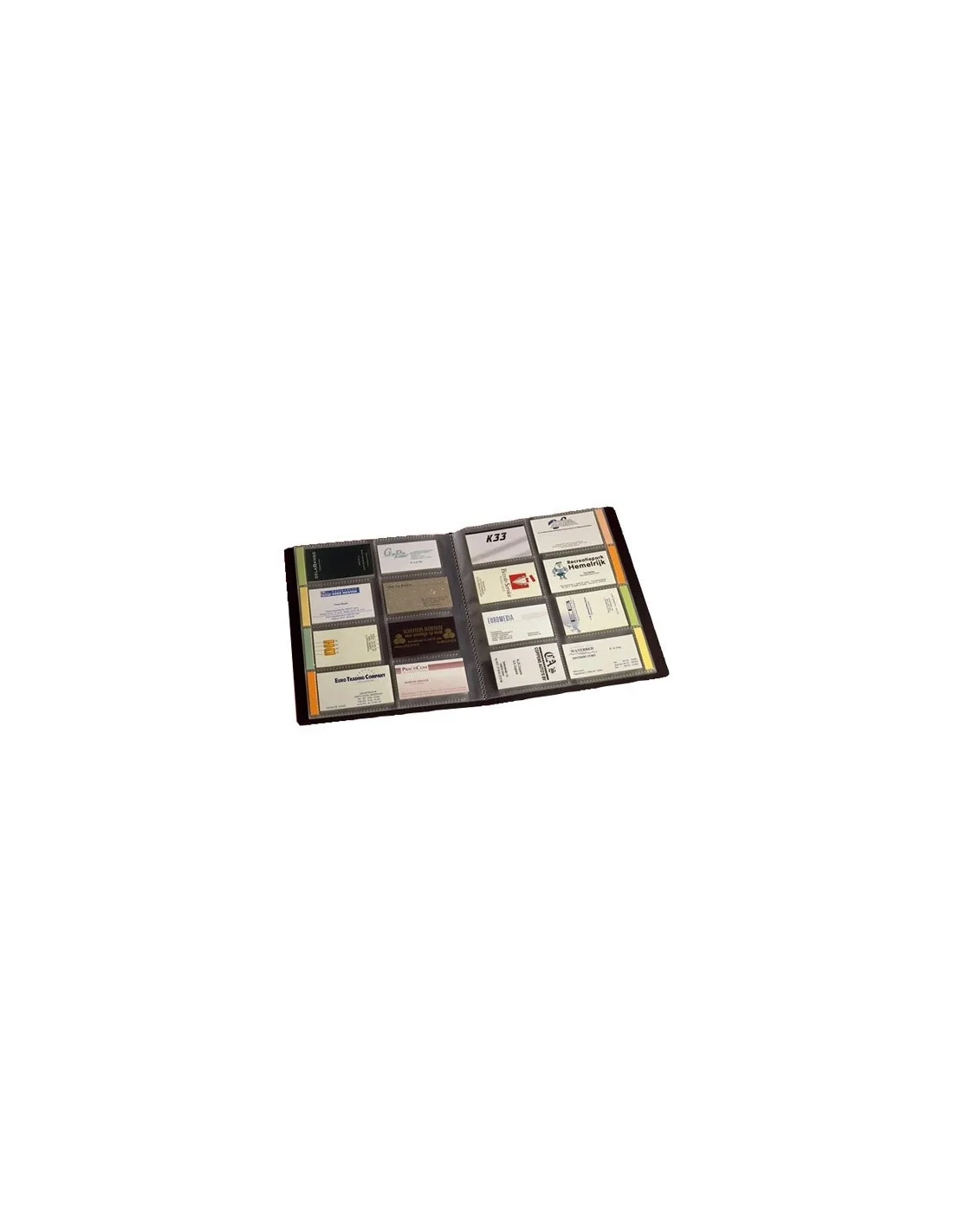 Tarjetero gigante para 608 tarjetas de visita, 8 tarjetas por página, lomo personalizable. Fundas con pestañas para clasificación. Etiquetas de colores incluidas. Tamaño: 230 x 280 mm. Lomo: 30 mm.Tarjetero gigante 23 x 28 cm OfficeBox Tarjetero de polipropileno negro para 608 tarjetas de visita. 8 tarjetas por página. Lomo de 30 mm personalizable