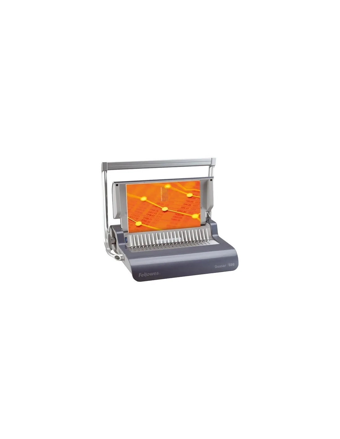 Perfora hasta 20 hojas. Encuaderna hasta 500 hojas A4 de 80g con un canutillo de 51 mm. Selector de diámetro de canutillo. Dim: 474 x 518 x 206 mm, peso 7.52 kg.Encuaderno Quasar 500