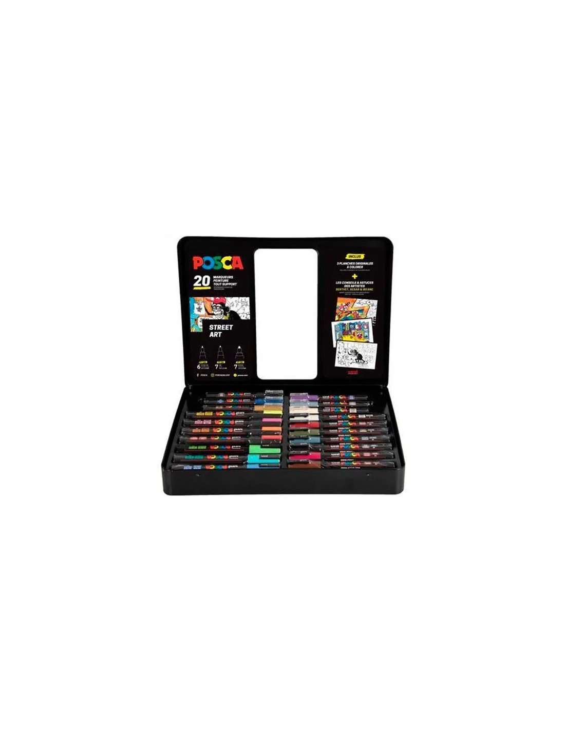 Marcador de pintura Posca maleta metálica con 20 rotuladores con trazos y colores surtidos, incluye 3 láminas para colorear y los consejos del artista Dirty Harry