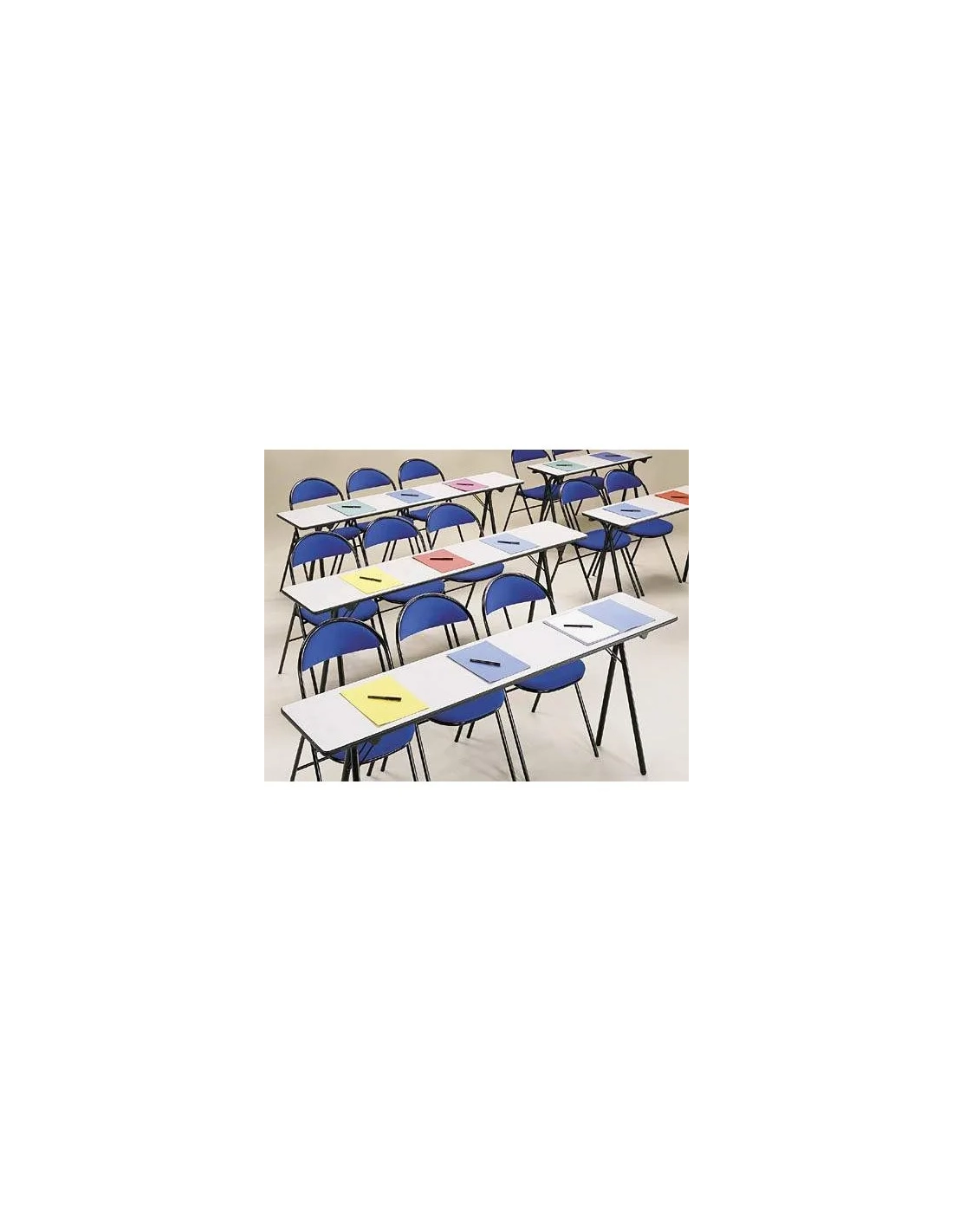 Mesa de formación plegable de gran estabilidad y fácil de estocar una vez plegada. Tablero paneles de partículas melaminadas certificados PEFC/ 10-4-8, grosor 19 mm con cantos PVC redondeados. Patas plegables en tubo metal acabado epoxi Ø 30 mm con calzos de estabilización.