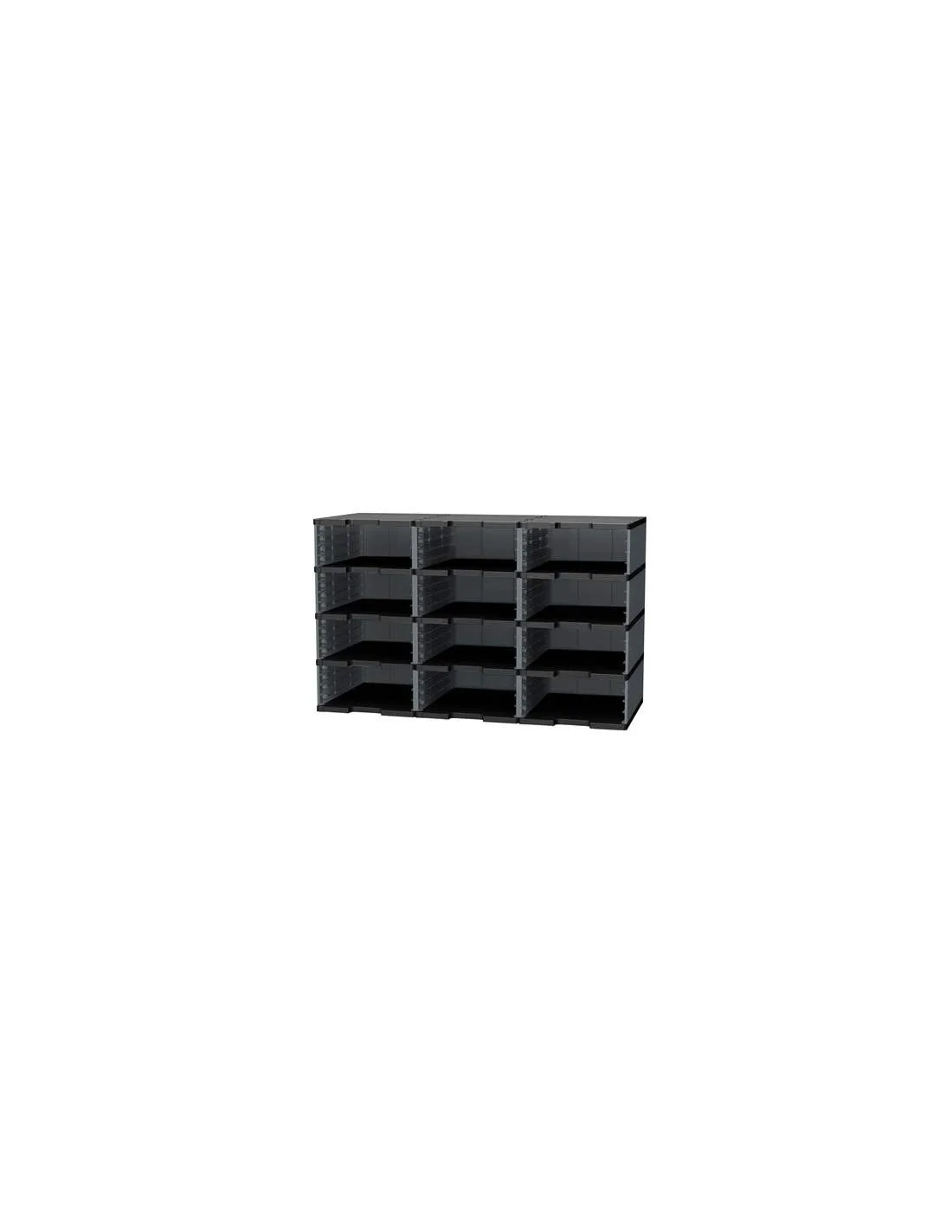 Modulo organizador 12 casillas talla jumbo gris. Para documentos de un formato de hasta 24 x 32 cm. En plástico de poliestireno reciclable. con la certificación Angel Azul. Exterior gris. interior negro. Se entrega desmontado.Jumbo de dimensiones externas: Alt. 14.5 x An. 28.8 x Fon. 35.4 cm y útiles: Alt. 11.6 x An. 25.6 x Fon. 34 cm.Para documentos de un formato de hasta 24 x 32 cm. En plástico de poliestireno reciclable. con la certificación Angel Azul. Exterior gris. interior negro.