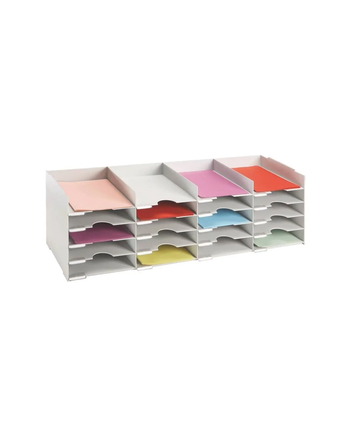 Modulo organizador de 20 compartimentos para clasificar documentos de un formato de hasta 24x32 cm, módulo compuesto de 4 columnas de 5 compartimentos indexados (no extraibles) medidas útiles de cada compartimento en cm :Alto 6 x ancho 22 x 30 de fondo.