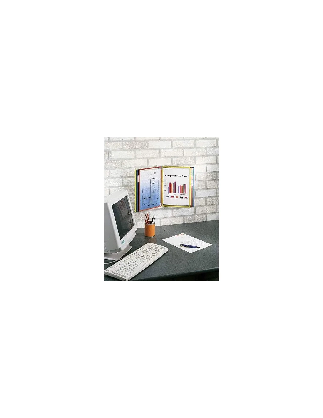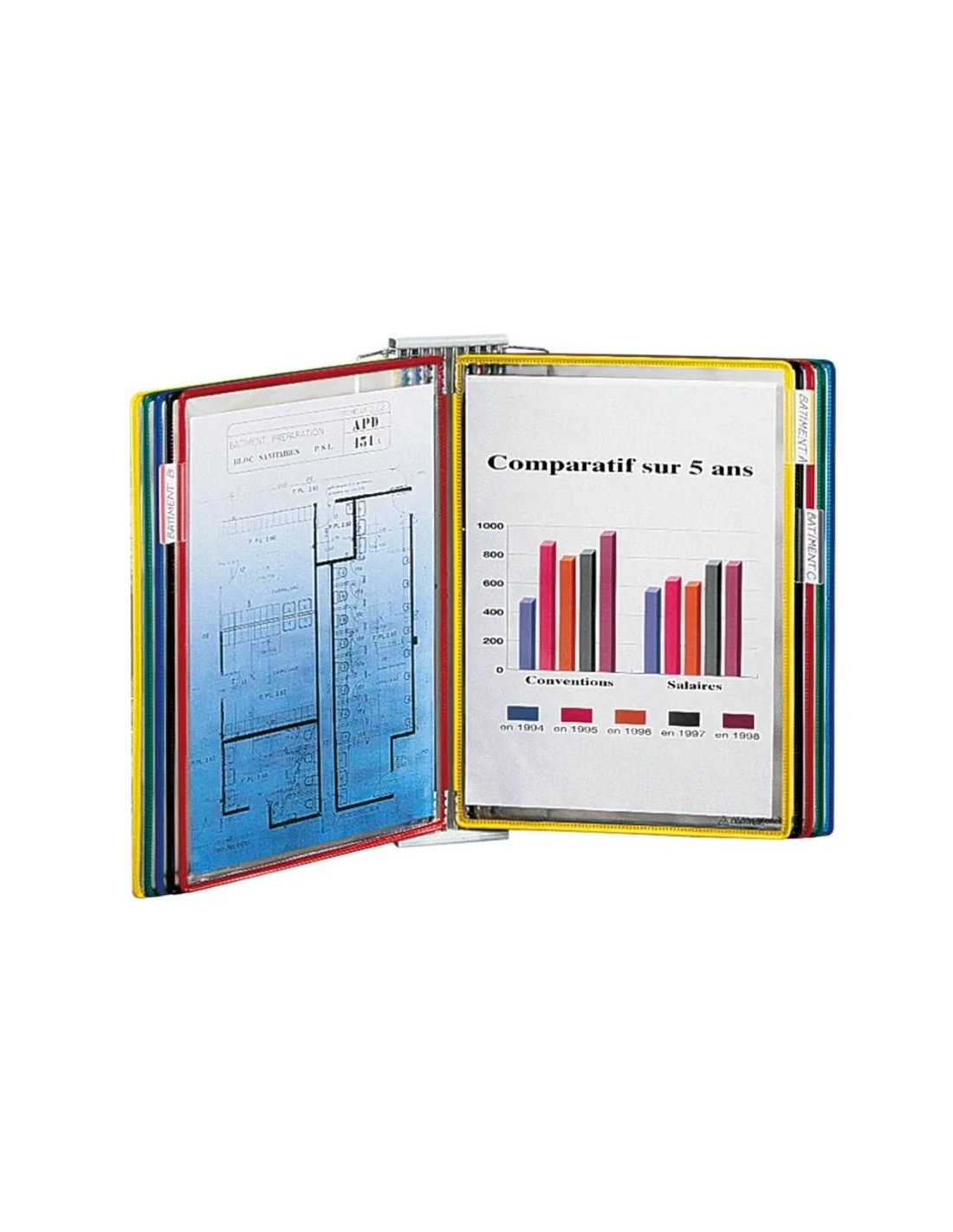 Metálico, 10 fundas tamaño A4 con pivotes en colores surtidos y 5 índices indicadores. Equipado con 4 topes laterales. Incluye material de fijación a la pared.