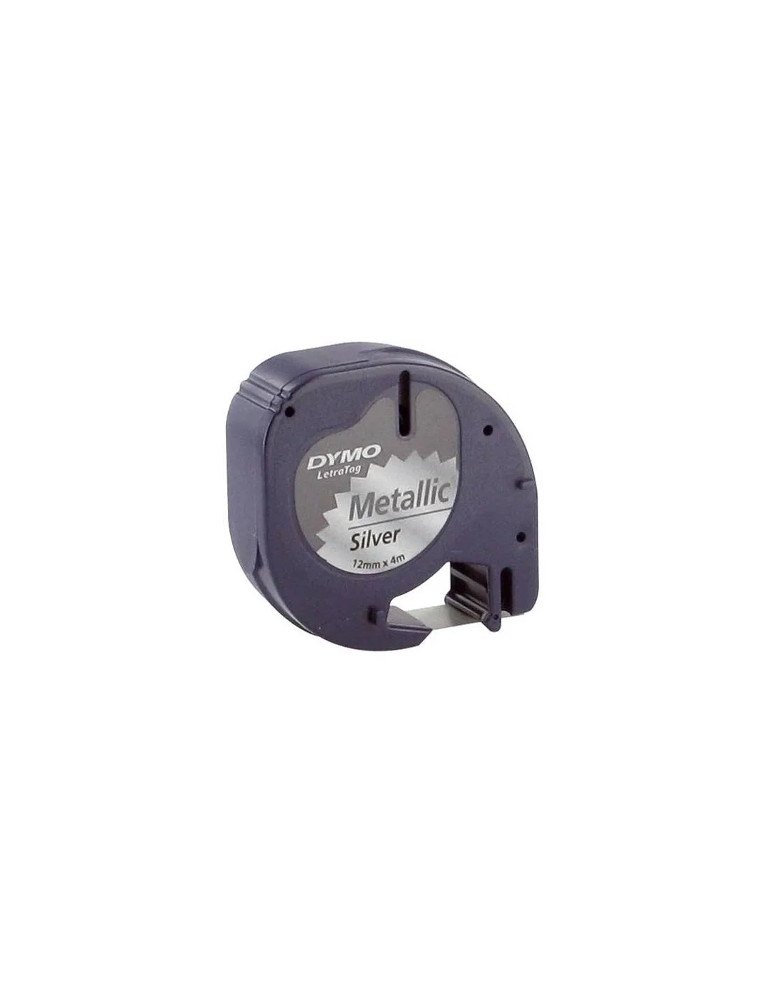 Cinta precortada que permite separa fácilmente la etiqueta de su soporte.Cinta metalizada de color plata para rotuladora LetraTag 12 mm de ancho por 4 metros de largo, escritura color negro sobre fondo color plata