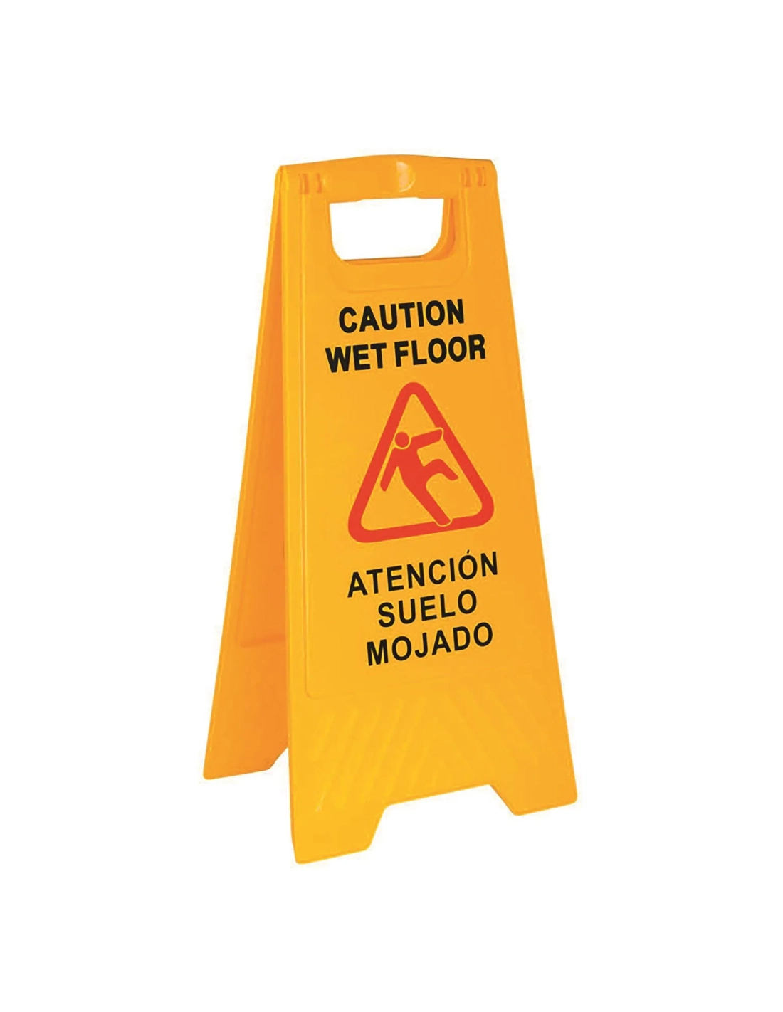 Indicador vertical plegable para suelo mojado. Texto en dos idiomas: castellano e inglés . Fabricado en polipropileno. Dimensiones: An. 29,5 x Alt. 62 cm.