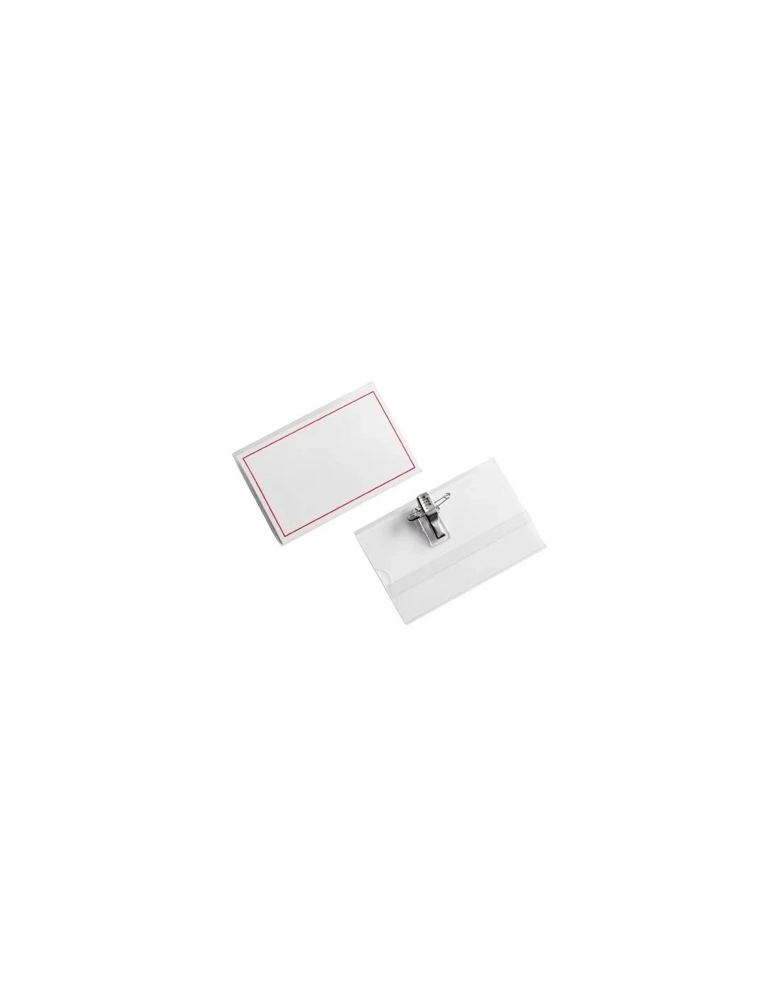 PVC transparente 54 x 90 mm. Con fijación doble, garra (pinza) o alfiler en metal cromado. Tarjeta con contorno rojo dentro de la chapa. Caja de 50.