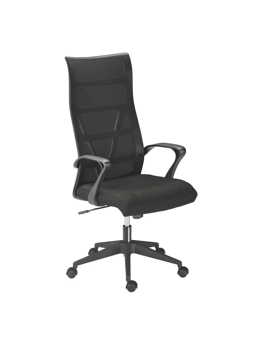 Material: asiento tejido 100 % poliéster. Respaldo de malla negro con soporte lumbar regulable en altura hasta 3 cm. Reposabrazos de poliuterano negro regulables en 5 alturas, adelante/atrás y orientable. Patas nailon armado. Ruedas para moqueta Ø 55 mm.