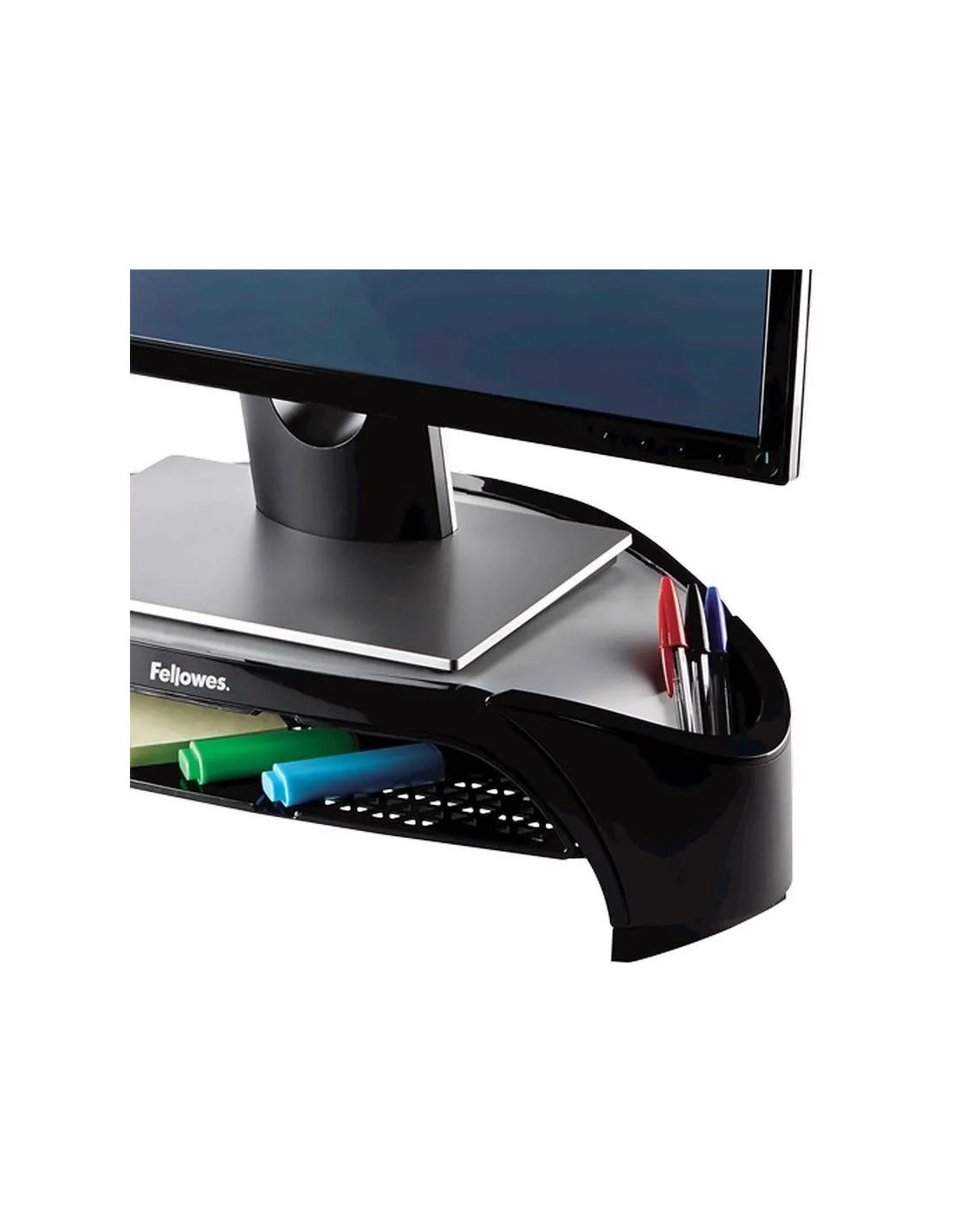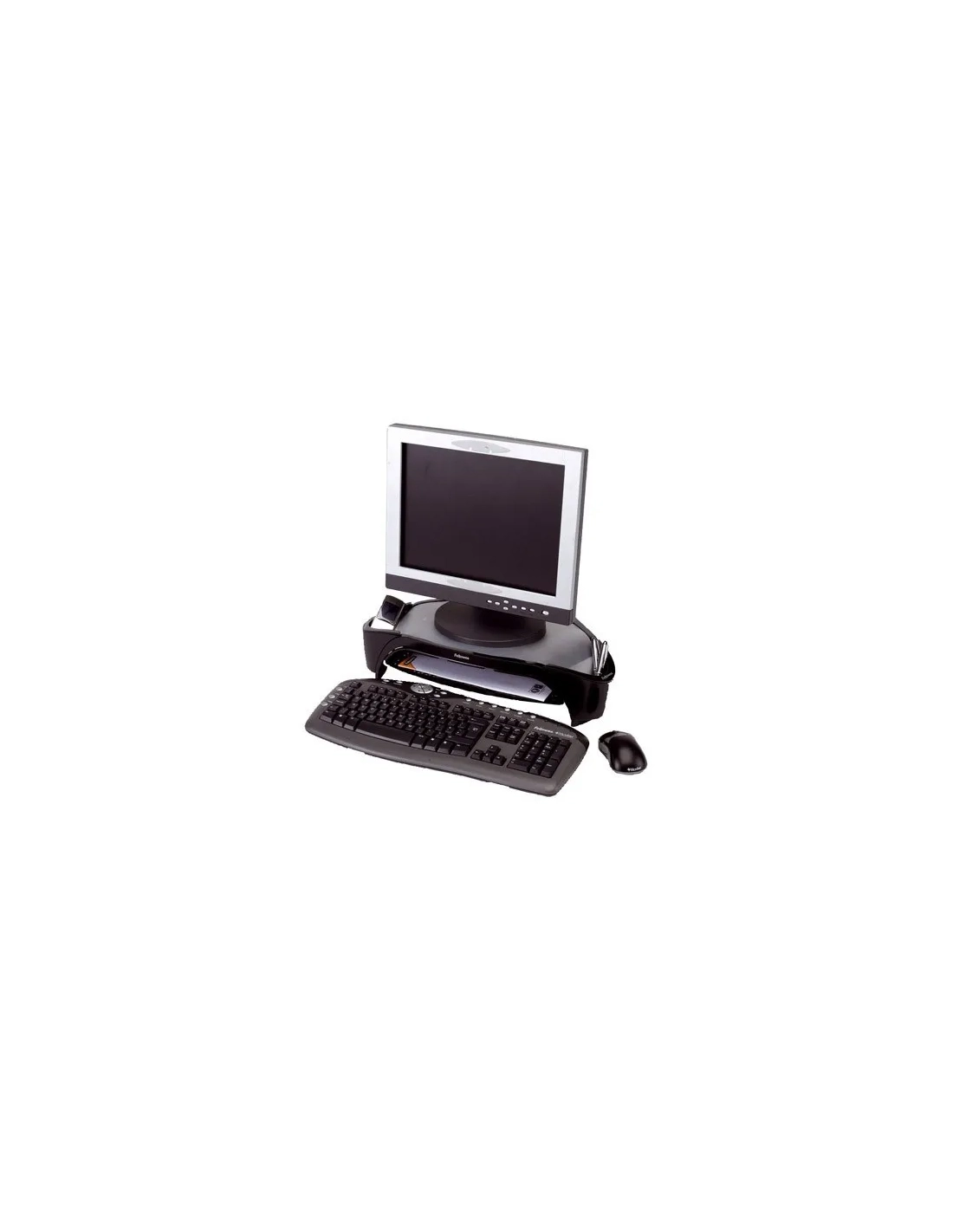 Soporte monitor que permite ajustar la pantalla a la altura de los ojos para prevenir malas posturas Diseño triangular que permite un puesto de trabajo despejado Inlcuye bandeja porta documentos Ajustable a tres alturas: 100mm, 115mm y 130mm
