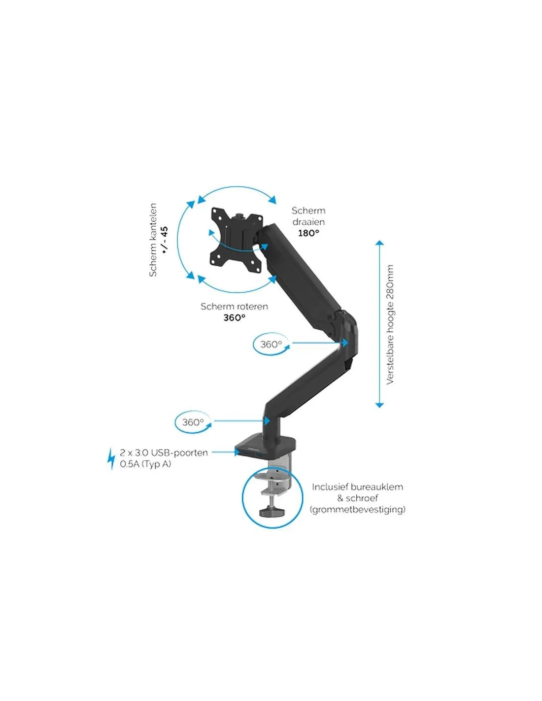Soporte con brazo articulado para pantalla que reduce espacio y adapta el puesto de trabajo a las necesidades del usuario. Brazo con ajuste a gas que permite colocar la pantalla sin esfuerzo y en múltiples posiciones. Altura máxima 39 cm. Extensión máxima 50 cm permitiendo colocar la pantalla a una distancia óptima de visión. Permite inclinar la pantalla hacia arriba o hacia abajo +/-15° y girarla 360º. Fácil de montar con sistema de fijación de pinza a mesas de entre 2 cm a 12 cm de grosor.