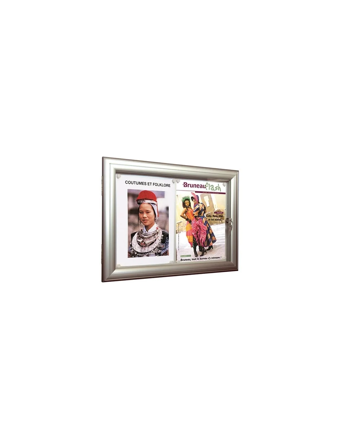 Fondo metálico para sujeción de documentos con imanes. Puerta reversible. Ligeras. Tornillería incluida. Sistema mecánico de impermeabilidad perfecta. Marco de aluminio anodizado. Cristal de seguridad. Grosor 4 mm. Para 2 hojas. 40x51,5cmVitrina exterior 2 hojas reverso