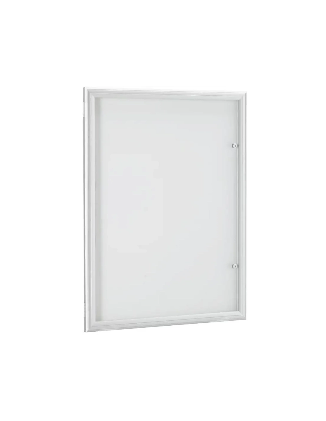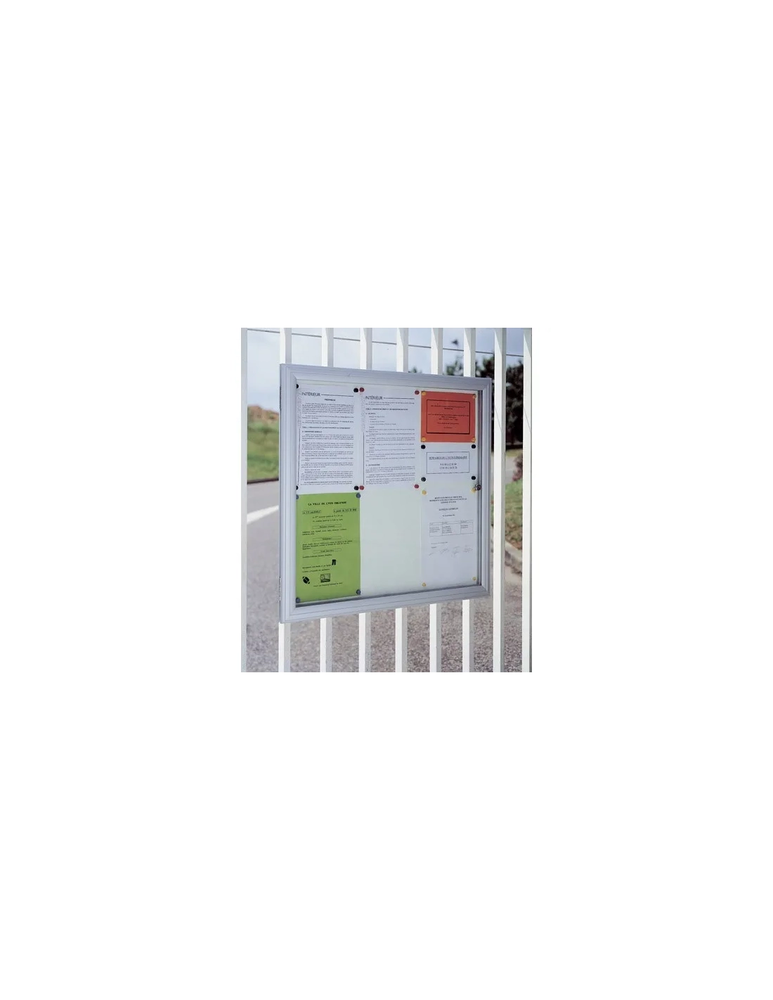 Fondo metálico para sujeción de documentos con imanes. Puerta reversible. Ligeras. Tornillería incluida. Sistema mecánico de impermeabilidad perfecta. Marco de aluminio anodizado. Cristal de seguridad. Grosor 4 mm. Para 9 hojas. 99x73cm