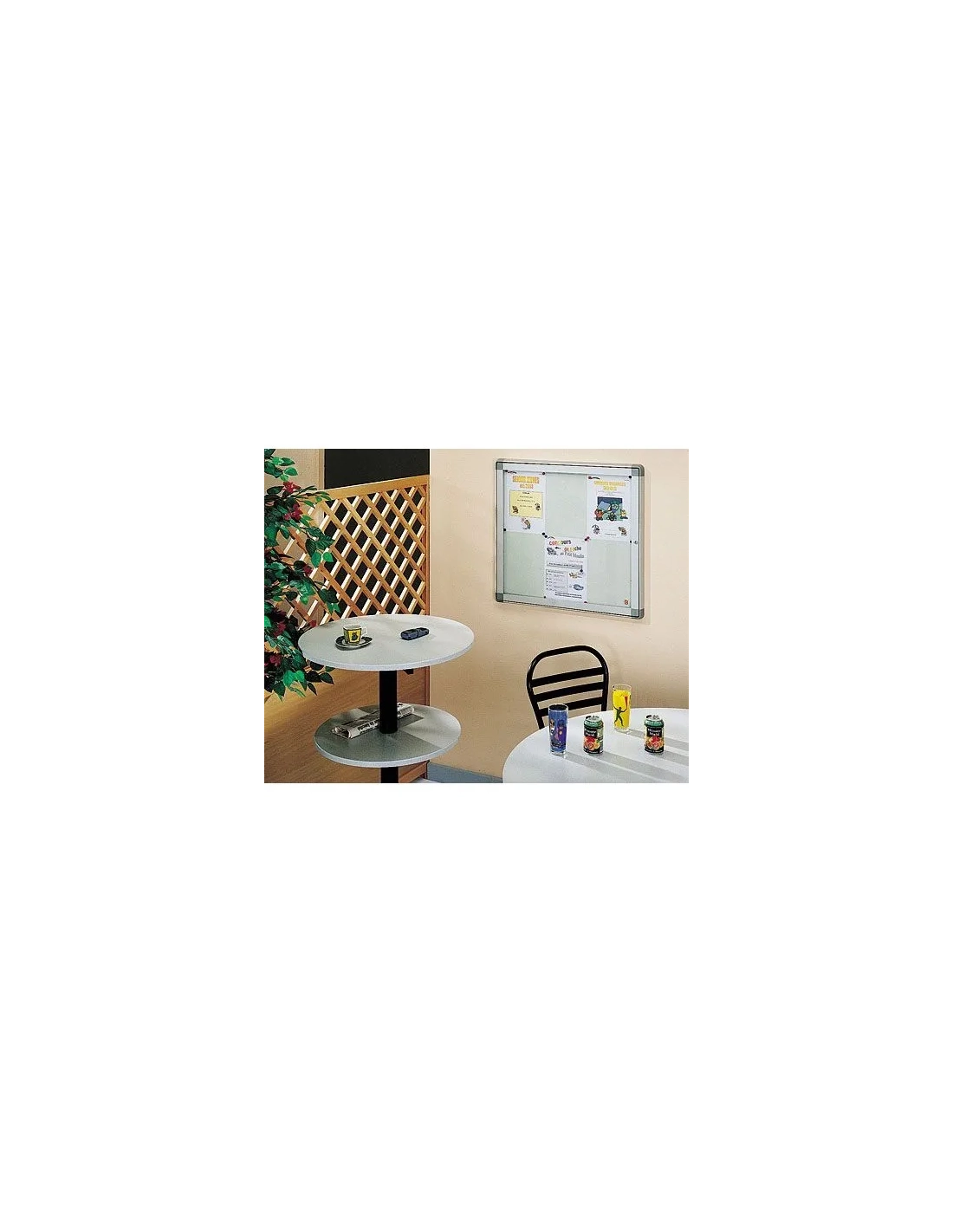 Cuadro perfilado de alumino lacado poliéster. 5 colores para elegir. Esquinas redondeadas, aspecto acero. Fondo metal prelacado gris (RAL 9002) Seguridad: Bisagras invertibles integradas en el marco y cerradura con doble cierre para mayor seguridad.Vitrina interior aluminio 8 hojas