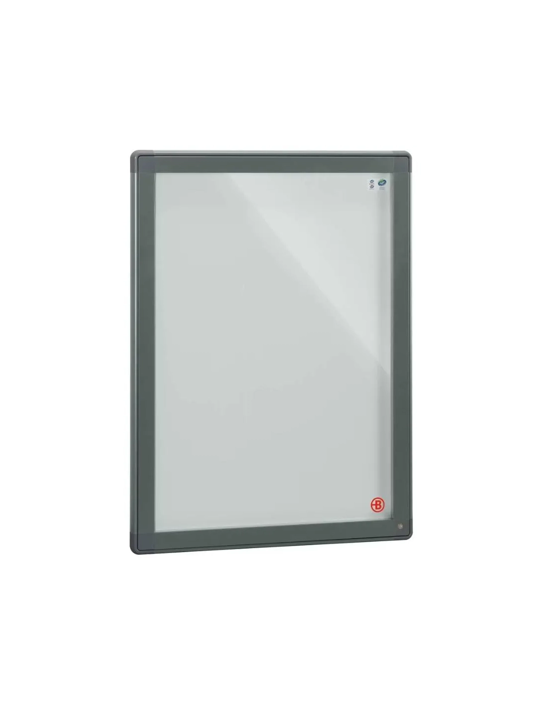 Estética: marco perfilado de aluminio lacado poliéster. Esquinas redondeadas (10% fibra de vidrio), aspecto de acero. Fondo metal prelacado gris (RAL 9002). Modelo Cristal Securit 4 mm. Seguras: bisagras invertibles integradas en el marco y cerradura con doble cierre para mayor seguridad. Dimensiones: Alt. 101 x An. 74 cm. Para 9 hojas.