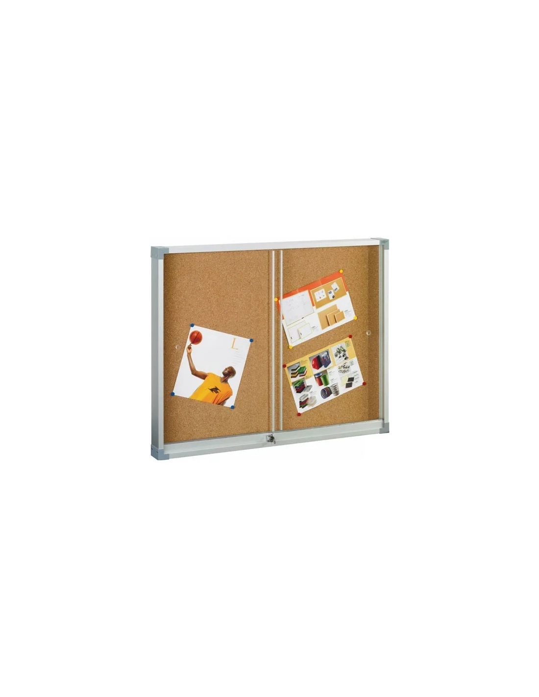 Sólida estructura en aluminio anonizado y cantoneras decorativas. Puertas de metacrilato correderas mediante mecanismo deslizante de rodamiento. Suministradas con elementos de fijación. Cerradura con llave. 90x120 cm.Vitrina para anuncios 90x120